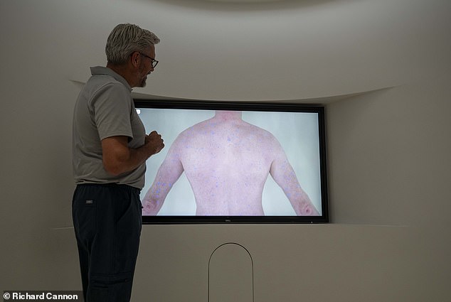 Dr Max prepares for the Neko skin scanner, which finds he has 812 marks on his skin