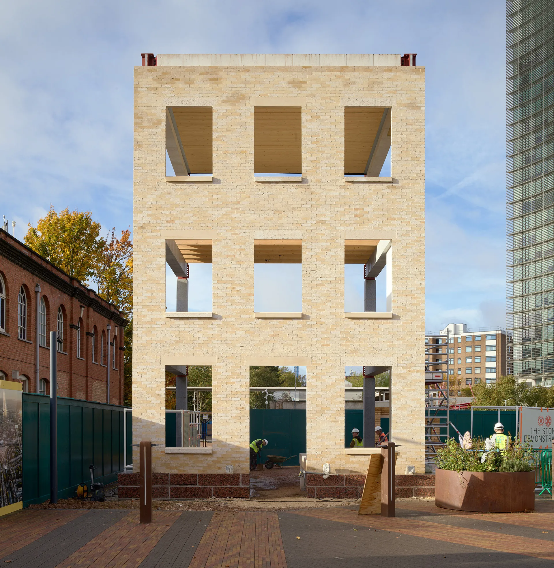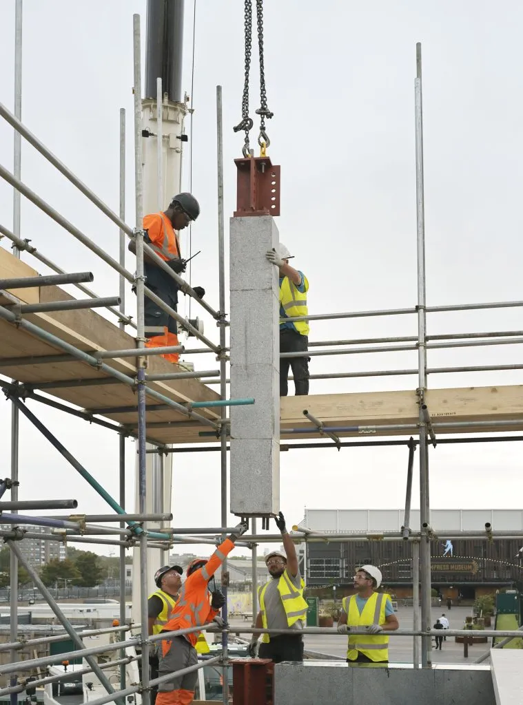Future Observatory, the Design Museum’s research programme focusing on the green transition, unveiled the Stone Demonstrator in November at Empress Place on the Earls Court development site. Designed by Groupwork with Webb Yates and Arup, the three-storey, 6.5 x 6.5m open-air installation tests the viability of pre-tensioned stone structures as a low-carbon alternative to steel and reinforced concrete.