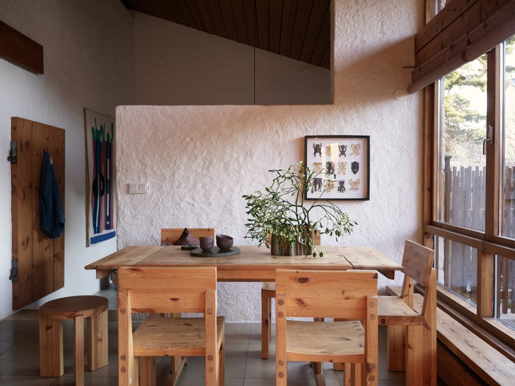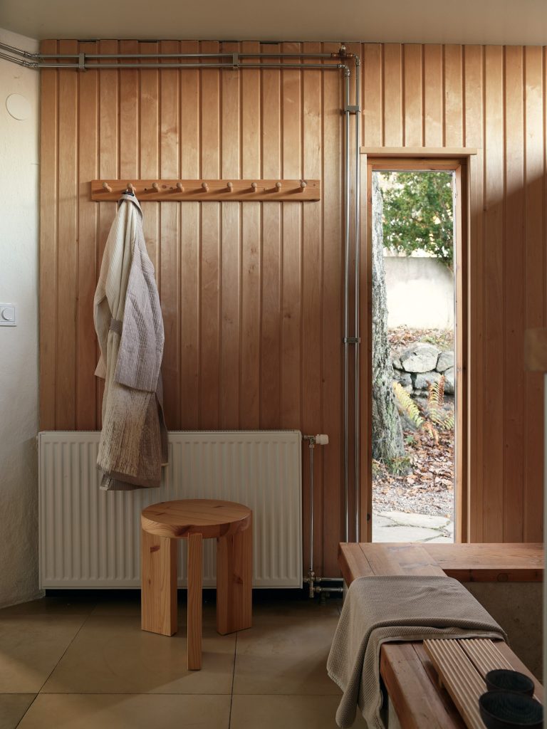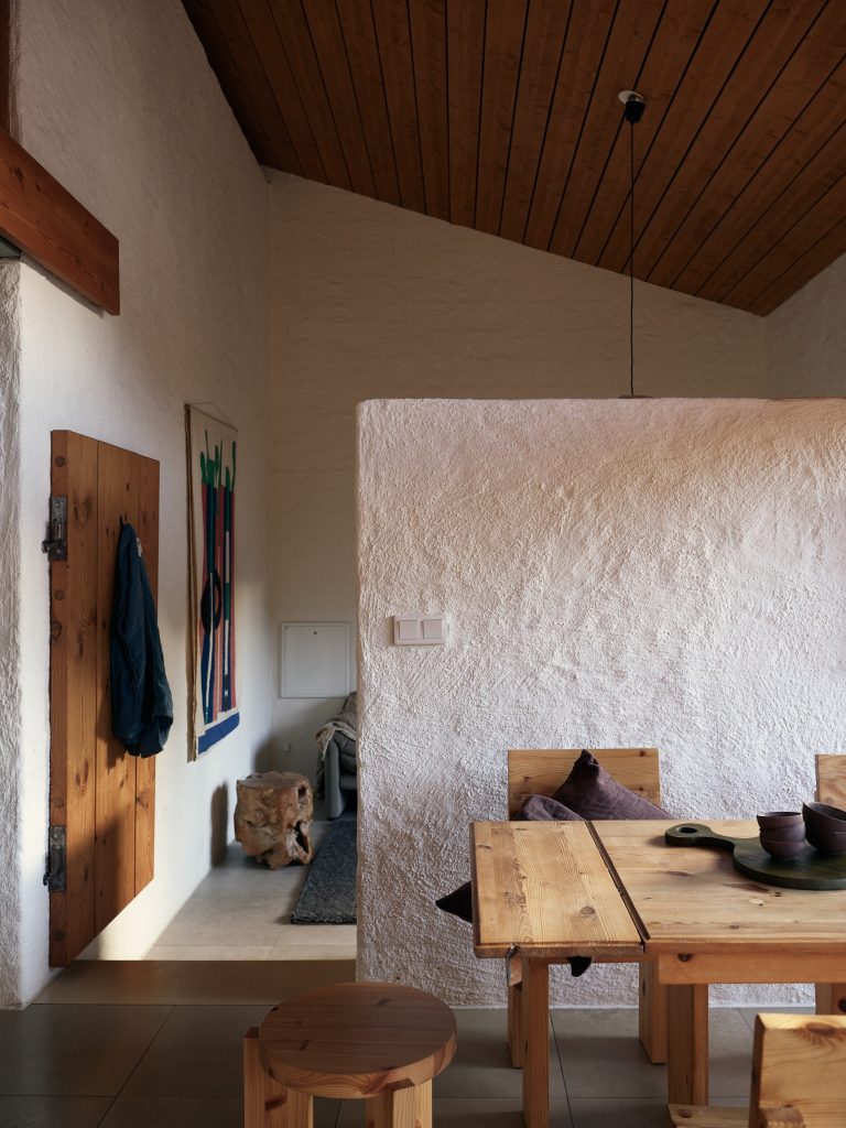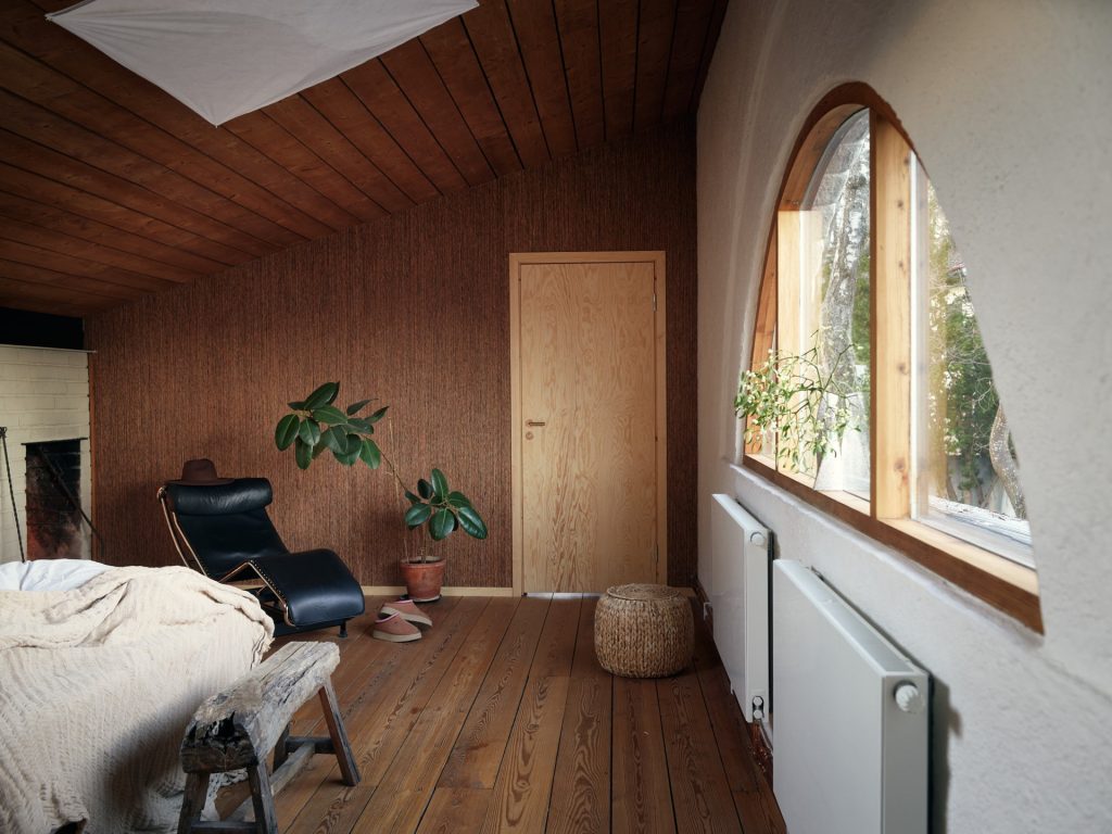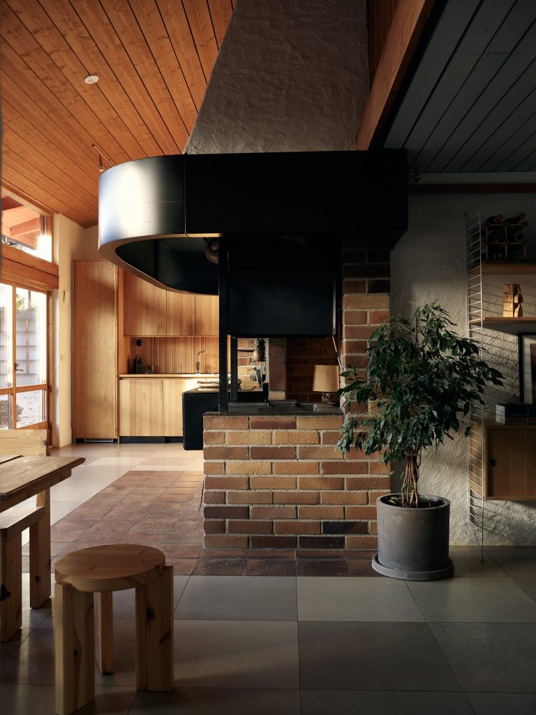 Now arranged as a two-level apartment in Mälarhöjden, southwest Stockholm, the 141sqm home forms the largest of three residences created from the original studio. The material palette is deliberately pared back: exposed timber joinery, simply fixed wood ceilings, white rendered walls, limestone floors and brickwork define the spaces throughout. Two fireplaces anchor the plan, while generous social spaces unfold naturally from the original atelier volume. A spa area and carefully integrated storage sit alongside the primary rooms, reinforcing the sense of a working building adapted thoughtfully for everyday life.