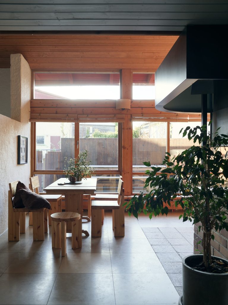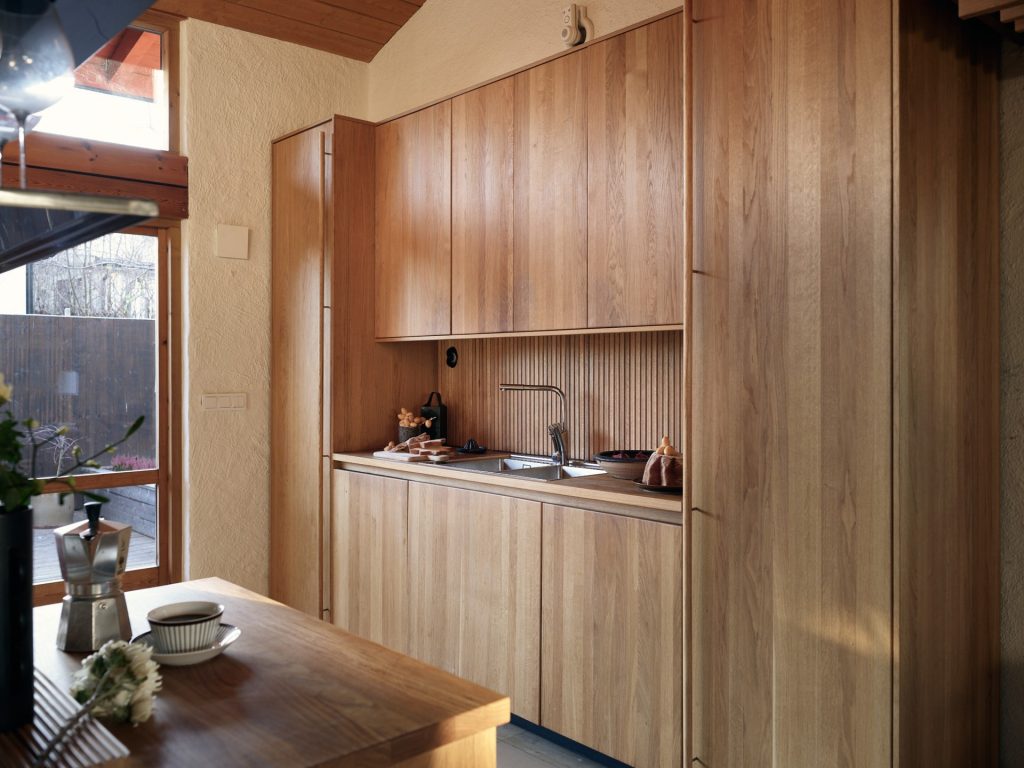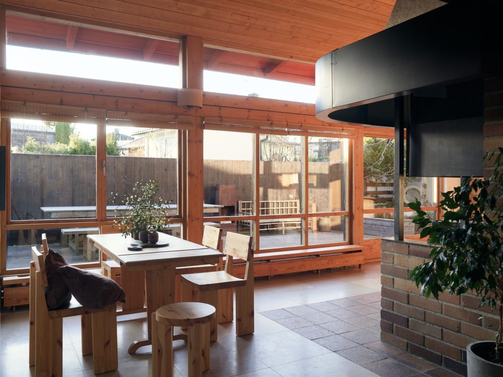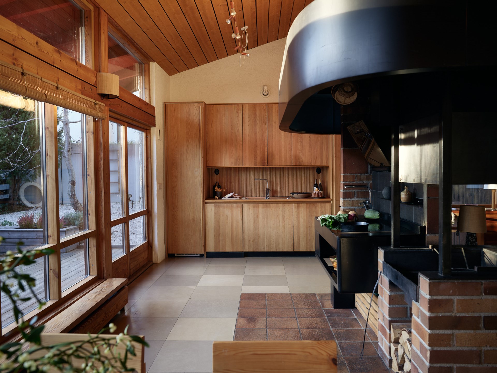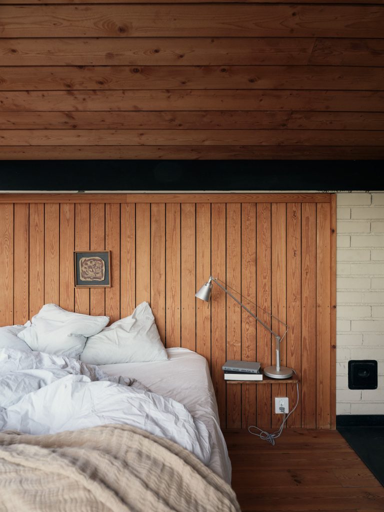 Now arranged as a two-level apartment in Mälarhöjden, southwest Stockholm, the 141sqm home forms the largest of three residences created from the original studio. The material palette is deliberately pared back: exposed timber joinery, simply fixed wood ceilings, white rendered walls, limestone floors and brickwork define the spaces throughout. Two fireplaces anchor the plan, while generous social spaces unfold naturally from the original atelier volume. A spa area and carefully integrated storage sit alongside the primary rooms, reinforcing the sense of a working building adapted thoughtfully for everyday life.