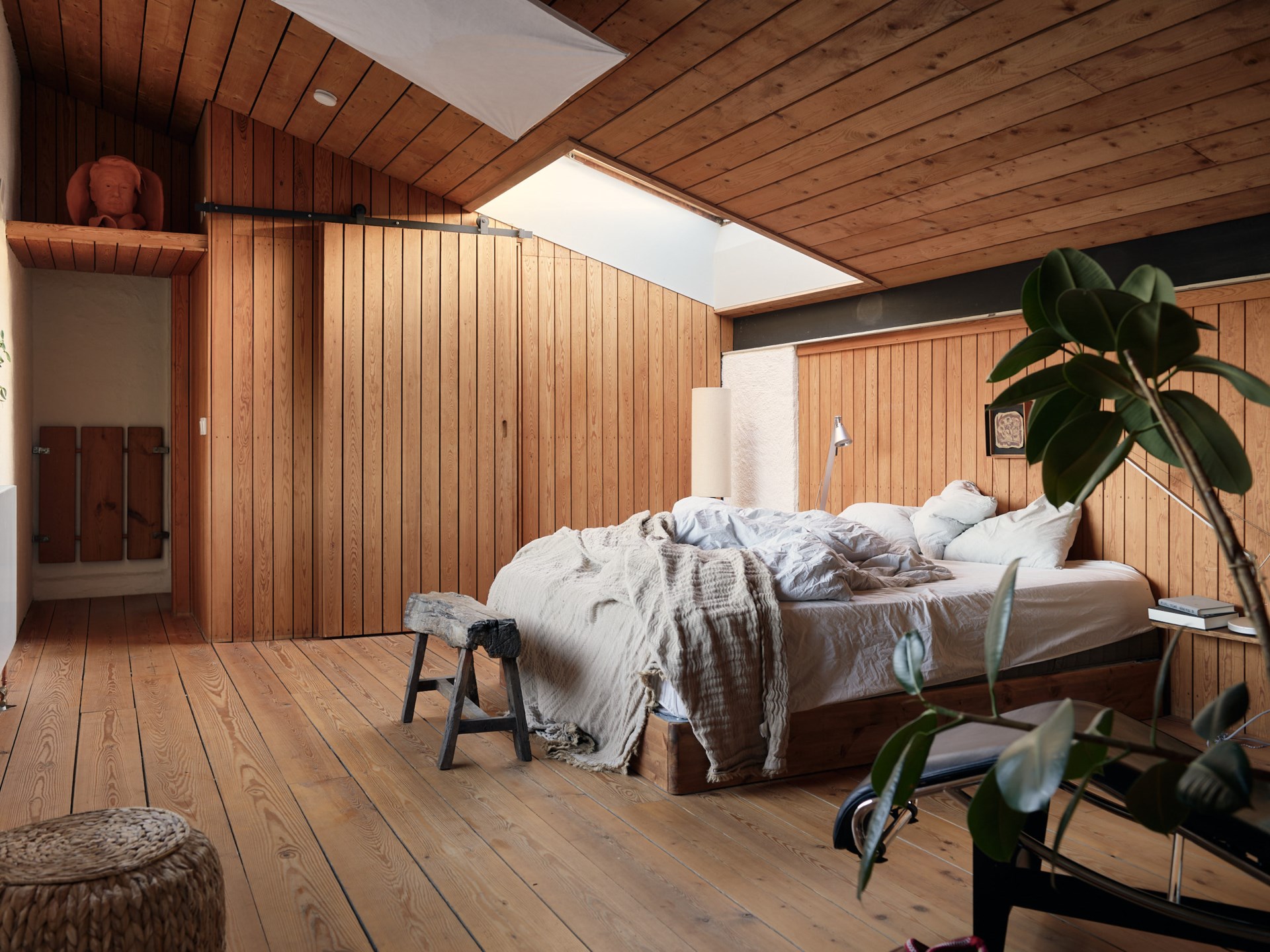 The pulse of this apartment is set by volume. Completed in 1968 as the working atelier for sculptor Hertha Hillfon, the space was conceived to accommodate monumental work, and that sense of scale remains today. Ceiling heights rise to almost five metres, daylight pours in through expansive window openings and the building communicates its purpose through form rather than added detail.