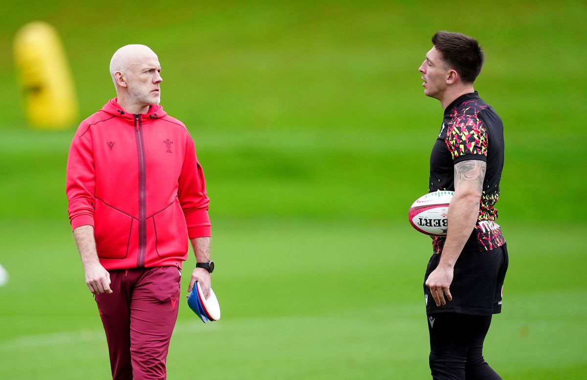 Wales head coach Steve Tandy speaks with Josh Adams (Image: David Davies/PA Wire.)