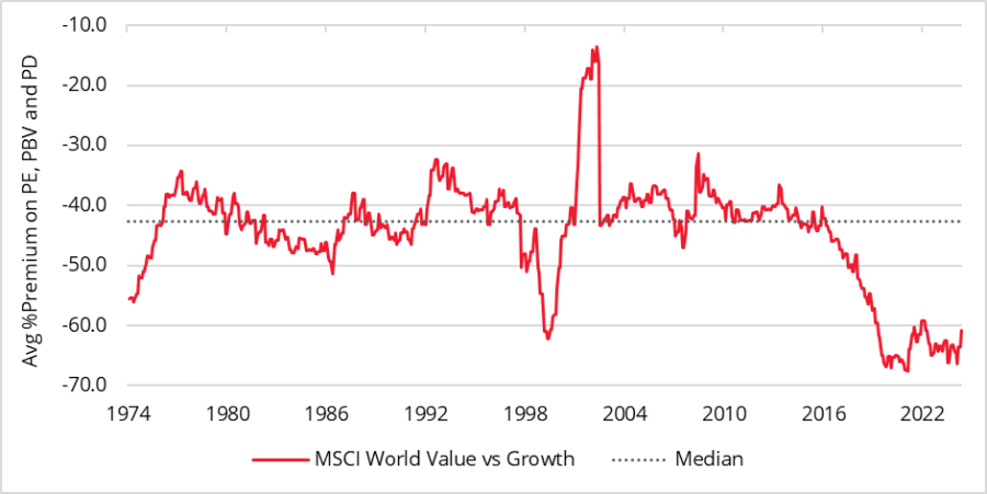 MSCI World value vs growth, average valuation premium