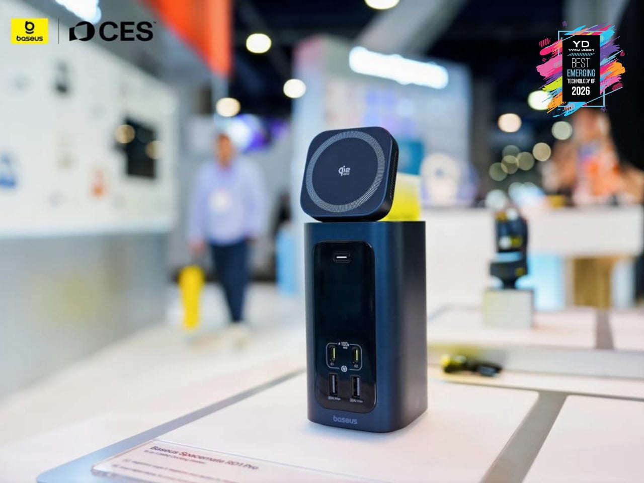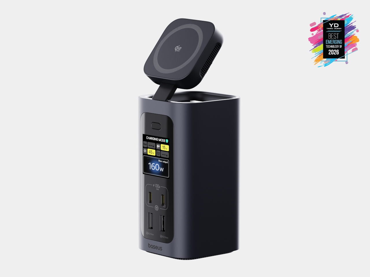 The Spacemate RD1 Pro merges that connectivity with a serious GaN power stack. An included 180 W GaN adapter feeds up to 160W of total output, with 100W PD reserved for the laptop, dual USB-C 100W-capable fast-charging ports for accessories, and a retractable Qi2.2 25W magnetic wireless pad on top for phones or earbuds. Intelligent power management dynamically allocates power and surfaces status on a front LED display, showing per-port draw and alerts. It feels like an early example of vertical, multifunctional docks becoming central power-and-I/O blocks for increasingly dense, multi-device workspaces.