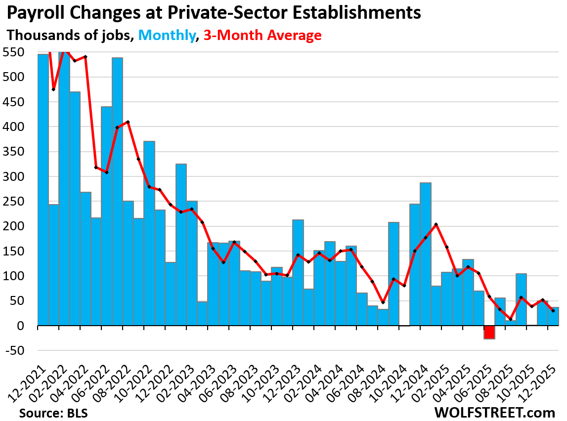 Nonfarm private-sector jobs rose by 37,000 in December and by 50,000 in November. Over the past three months, they rose by 88,000 combined (even as total payrolls dropped by 67,000 over the same period).