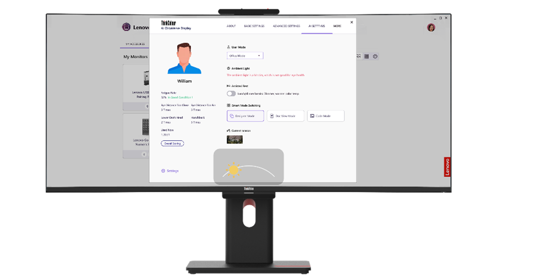 The intelligence in Lenovo’s advanced display concepts extends from user productivity to well-being. The AI-Powered Personalized Display Concept can deliver real-time visual solutions tailored to diverse users. Designed as a multi-user display concept, the solution provides different experiences according to users’ profiles, time of day, and geographic location for circadian auto-adaptations to deliver personalized display brightness, color temperature, and real-time wellness monitoring based on posture, eye fatigue, and other factors. The AI-powered display concept provides the ultimate in comfort and well-being by understanding and attuning to every user’s needs.