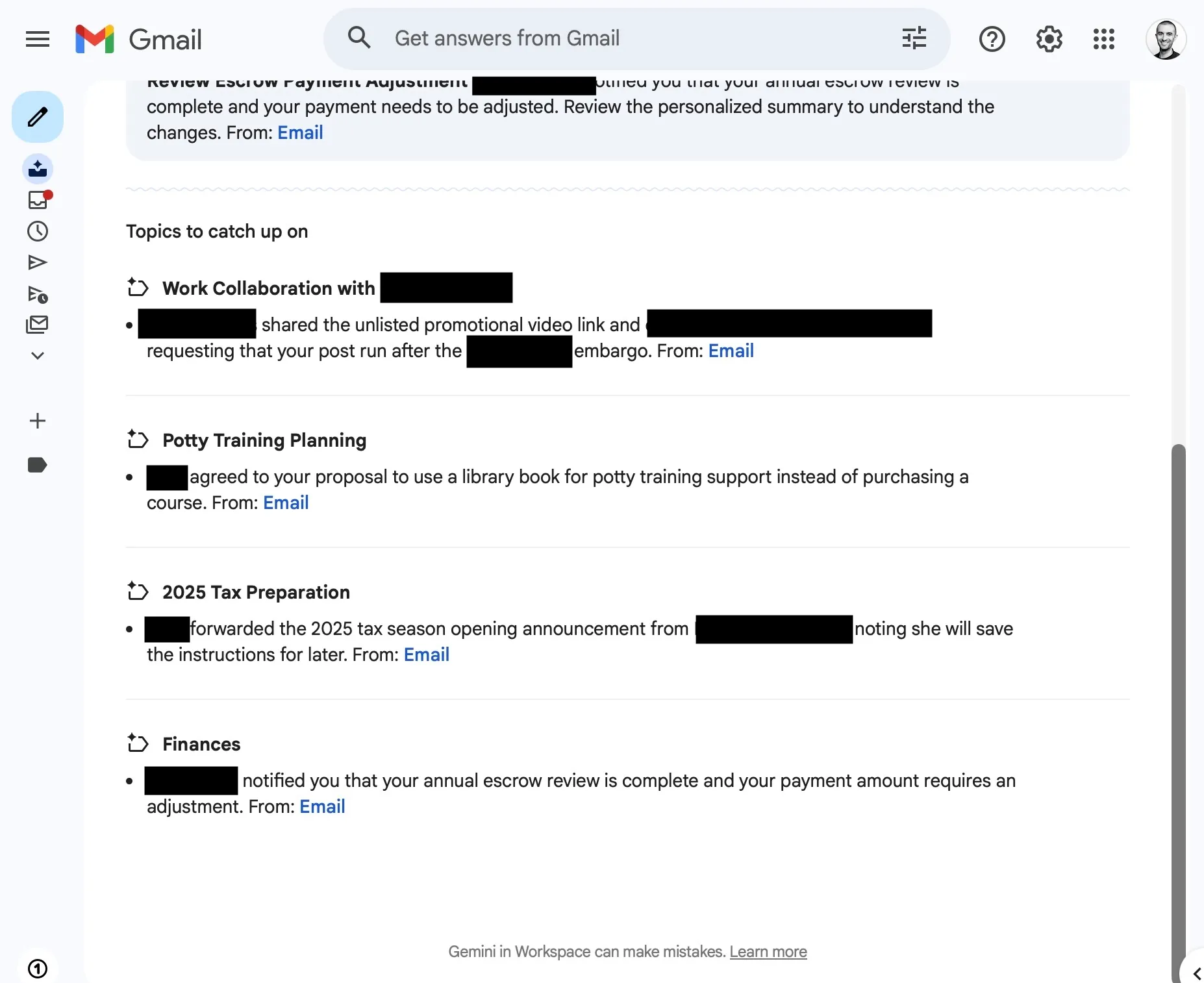 With AI Inbox, my inbox instead becomes an AI-generated page of short summaries to read. There are suggested to-dos at the top, with links to the emails they’re about if I want to dig in more or respond. Under the to-dos, there are topics to catch up on, also with links to the relevant emails. Perhaps most notably, AI Inbox has pulled in two things that I’ve archived and aren’t in my main inbox: conversations between my wife and me about tax preparation and potty training for our toddler.
