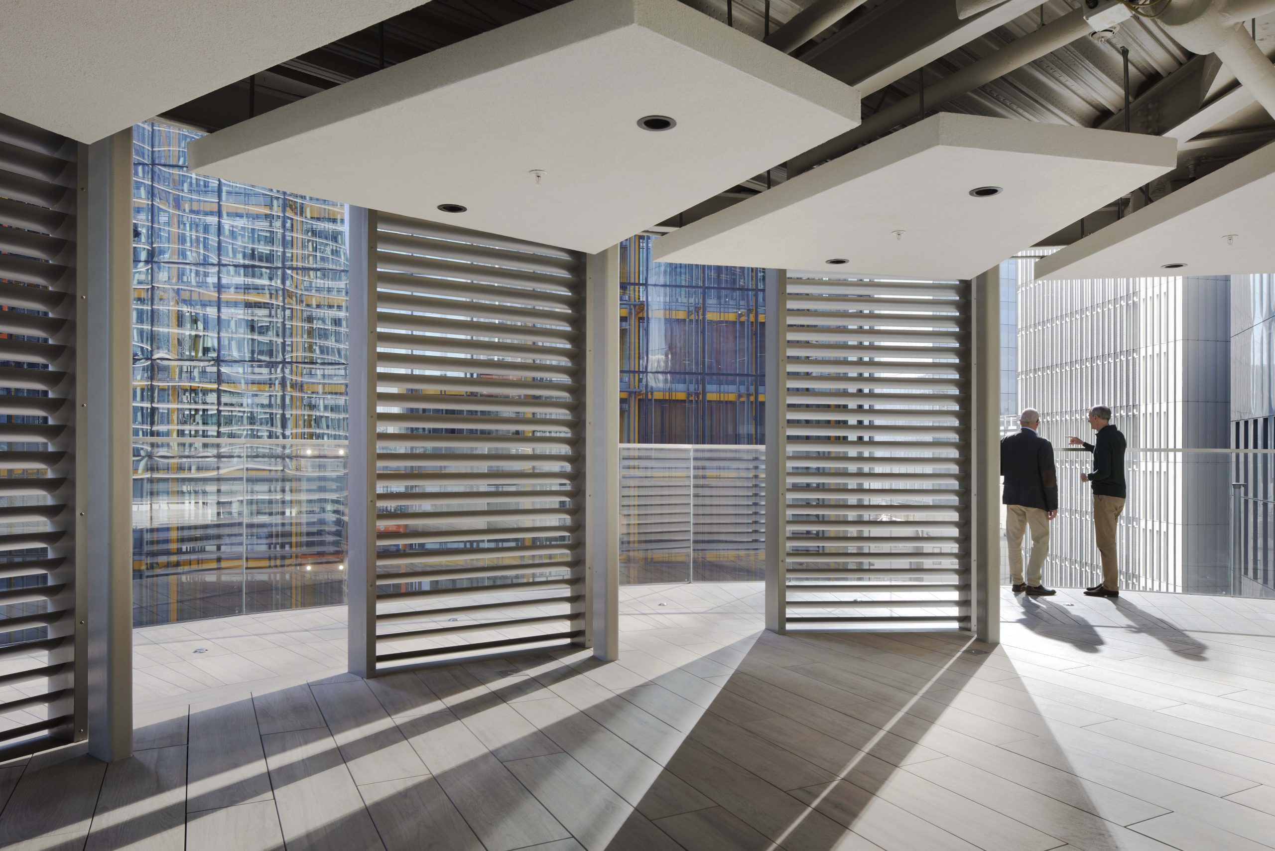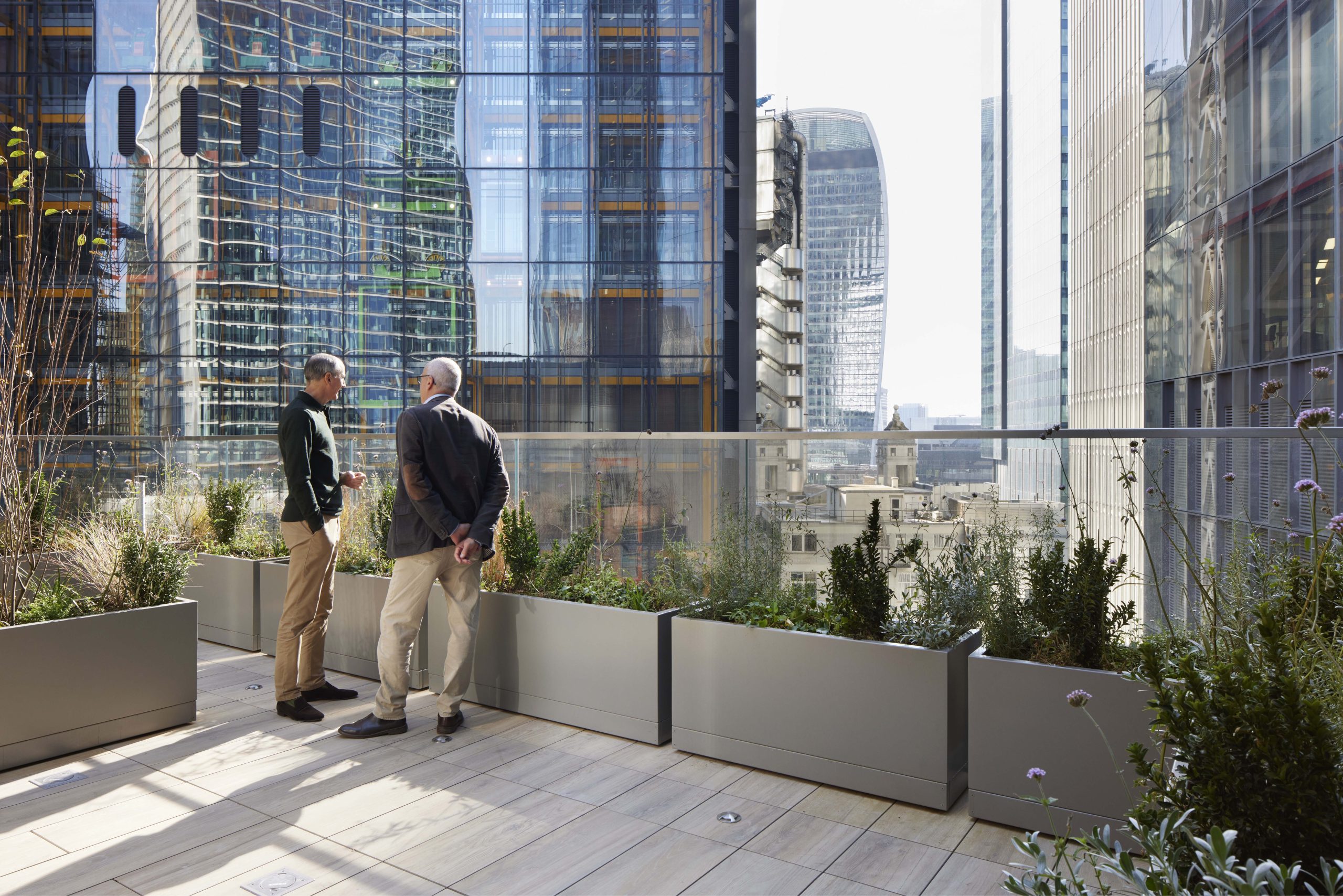 A new winter garden and landscaped roof terrace has been created on Level 10, with a mix of indoor and outdoor amenity space and views to surrounding office towers. The winter garden is heated in winter and naturally ventilated in summer. Its façade incorporates glass louvres and doors to access the roof terrace.