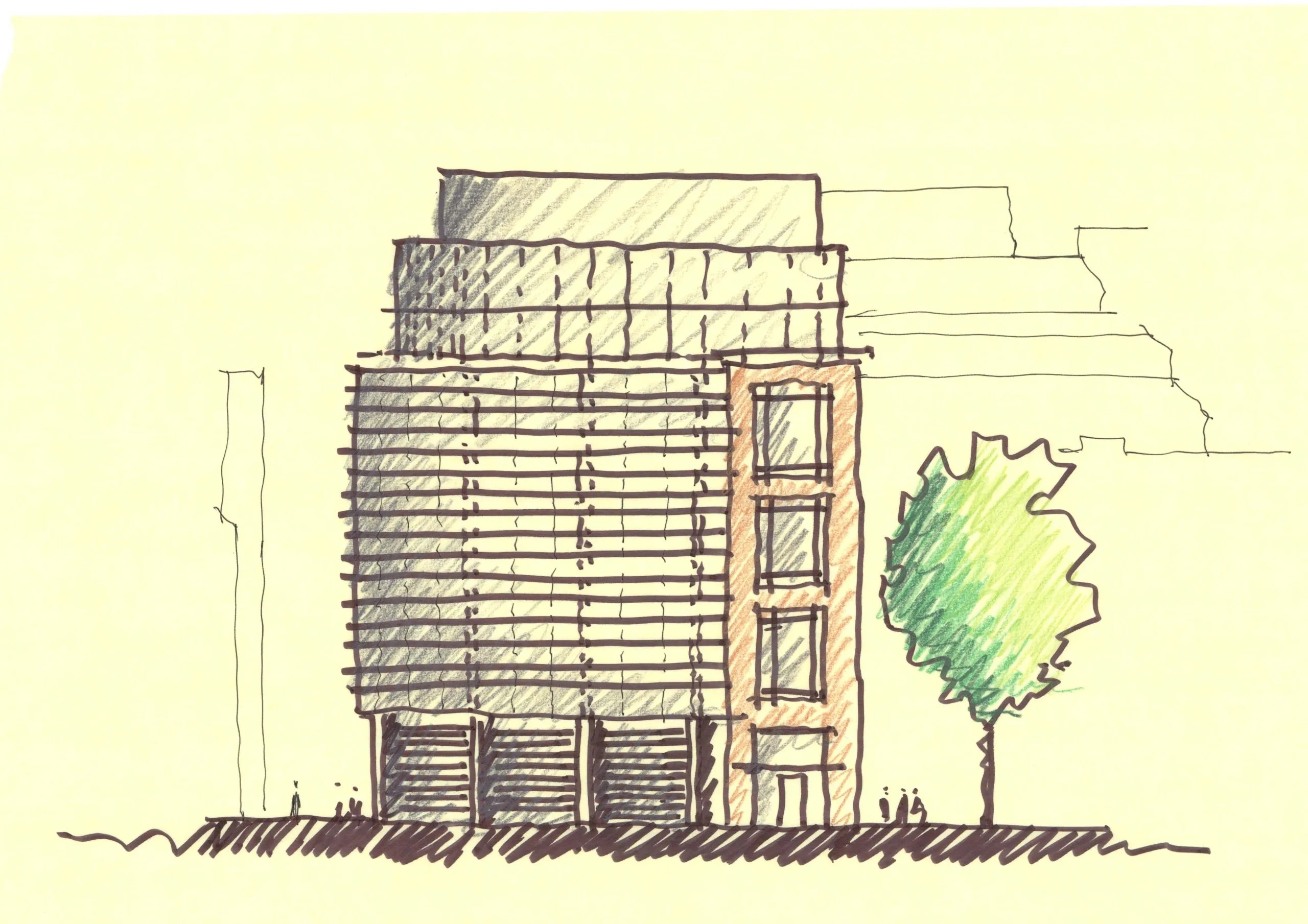 The façade design has been retained on the renovated building, its modulated curtain wall and fins between cladding panels still helping to mitigate solar gain.