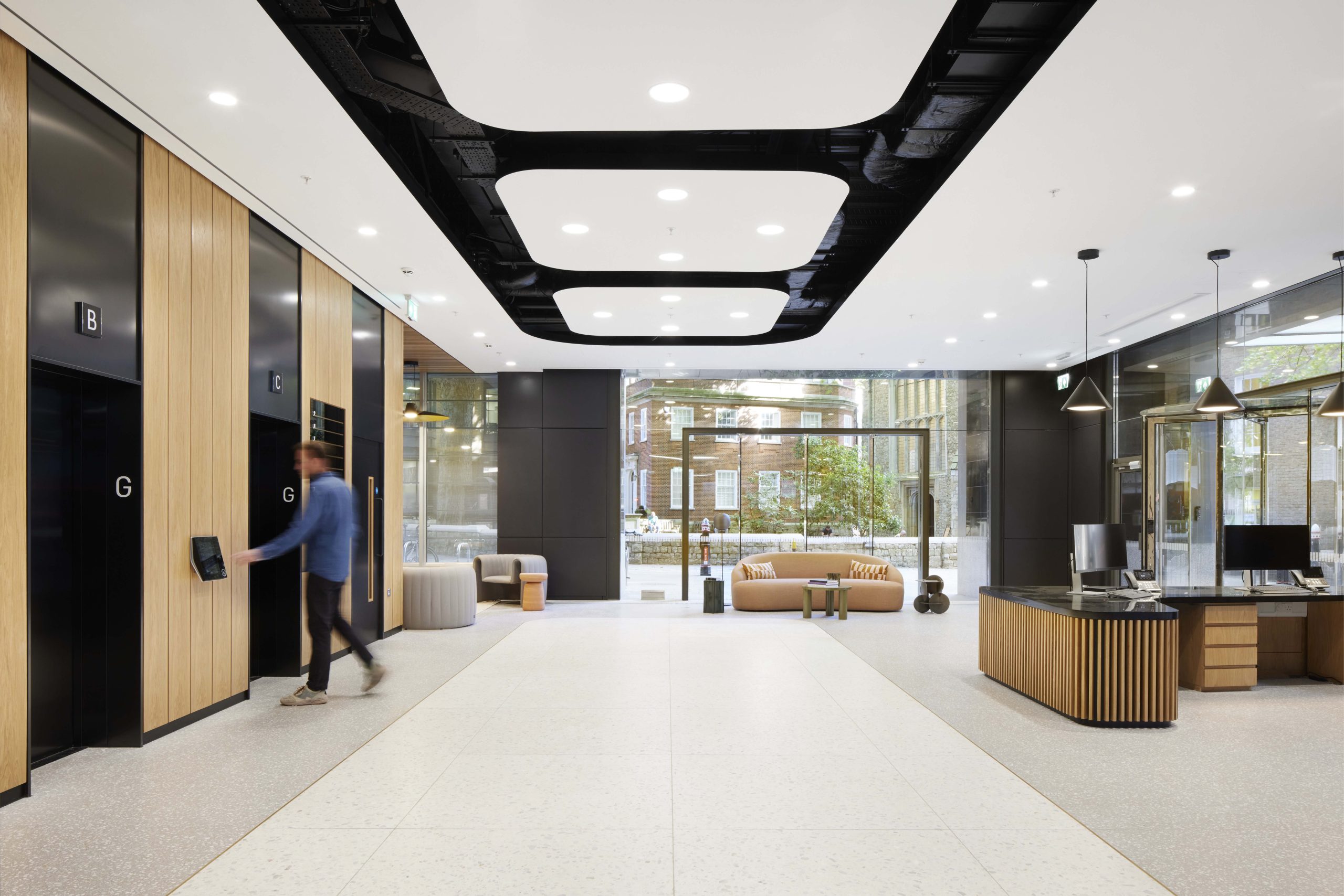The refurbishment of the entrance hall and the ground floor offices incorporates new lift designs, produced with specialist consultancy Kone, installed with deep blue interiors designed to complement wood panelling and tiling found elsewhere in the building.