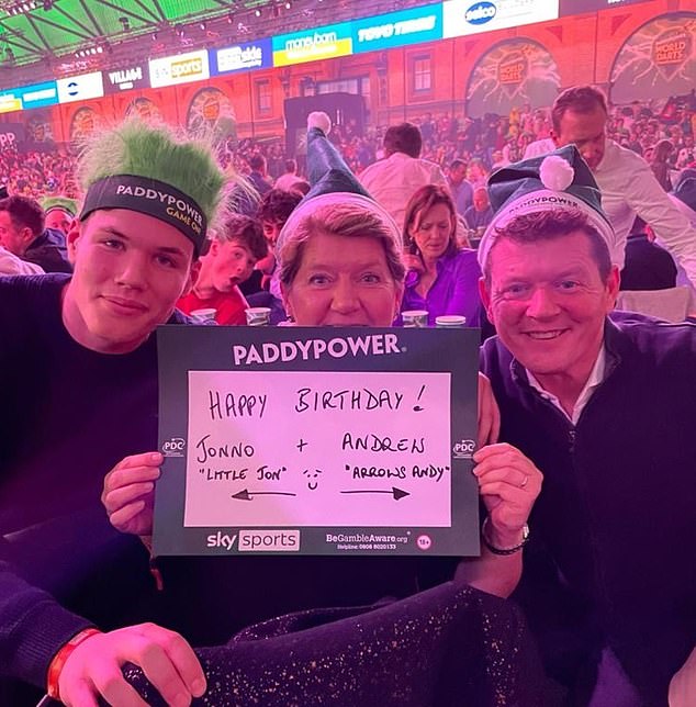 He is the nephew of sports broadcasting great Clare Balding (centre) – pictured: Jonno (left) and his racehorse trainer father Andrew (right) celebrating their birthdays at the darts