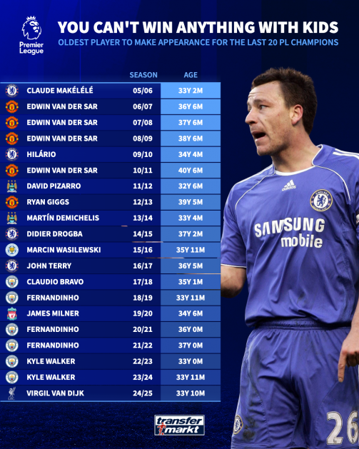 If we scan across the Premier League era since the 1992/93 season, no title-winning team has ever won the league without playing a player of at least 32 years of age. The oldest players for the last 20 champions is listed below. The likes of 36-year-old Terry in 2016/17 for Chelsea, 37-year-old Fernandinho in 2021/22 for Man City, or even 33-year-old van Dijk for Liverpool last term can’t be underestimated in their team’s eventual triumphs.