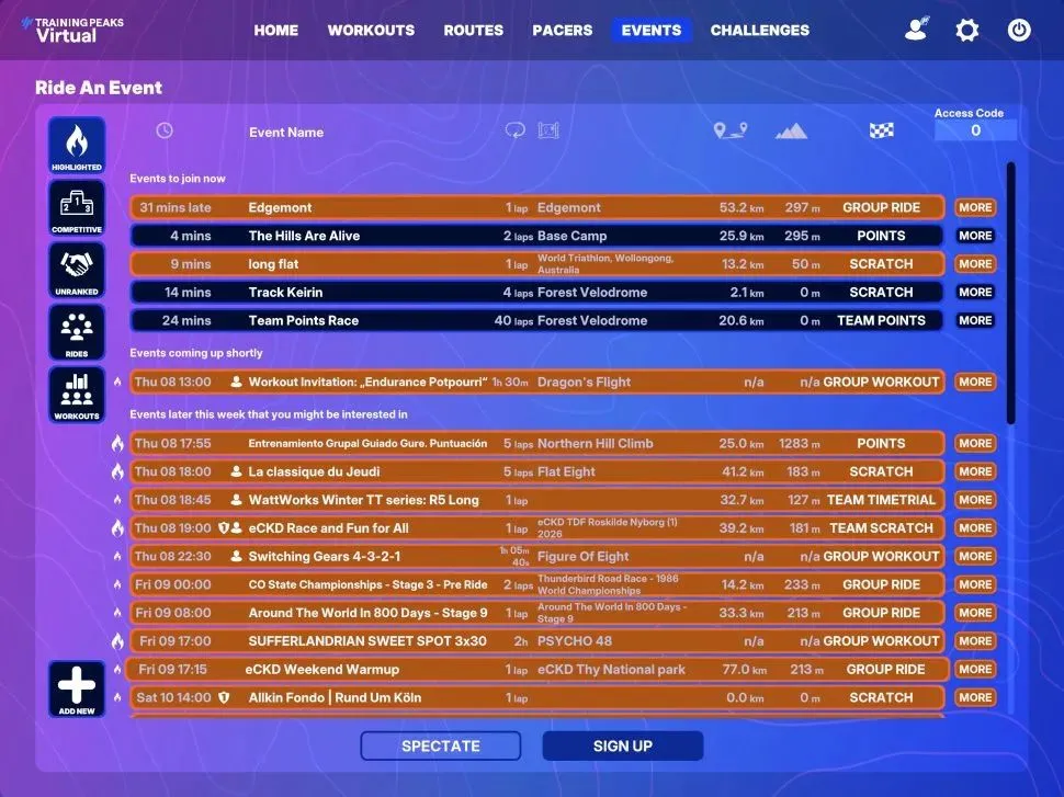 There are also higher level events, and for these you are required to do the usual verification processes mandatory on other platforms such as proving weight and power, as well as submitting your national governing body racing licence. To add another element of interest, there is a DS option as well. A team DS can spectate the race and riders in live time, and they can then send team chats to the riders to direct them on what is happening. Again, this is a neat feature that I really like, as I think it works well to encourage a real team environment even if a rider can’t actively race themselves for certain events.Â