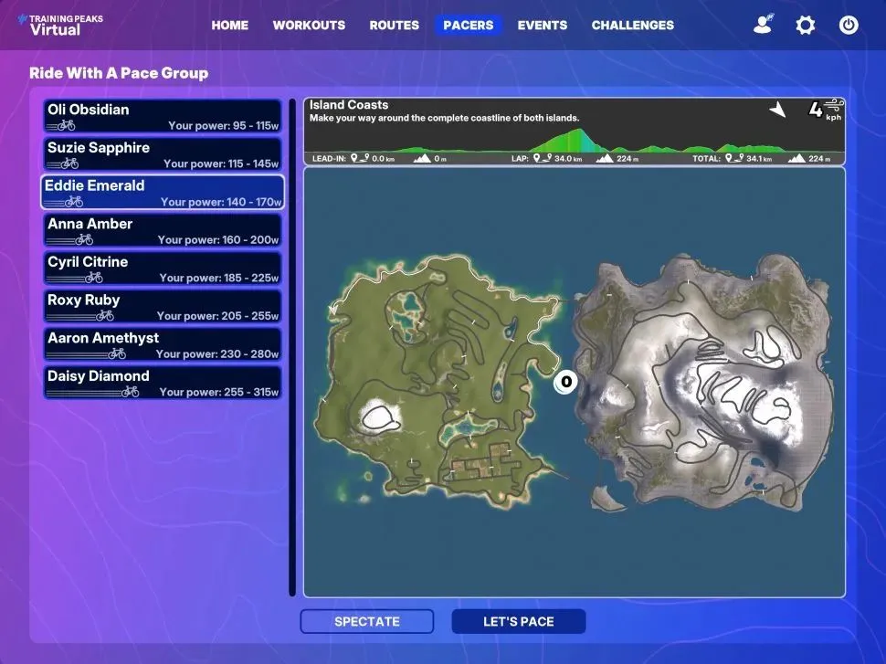 Once you enter the main page, you can select the type of ride that you want to do. Home has a summary of workouts of the day, routes to explore, races, pace groups, and recent routes ridden. From there, the top bar features Workouts, Routes, Pacers, Events, and Challenges to choose from.Â
