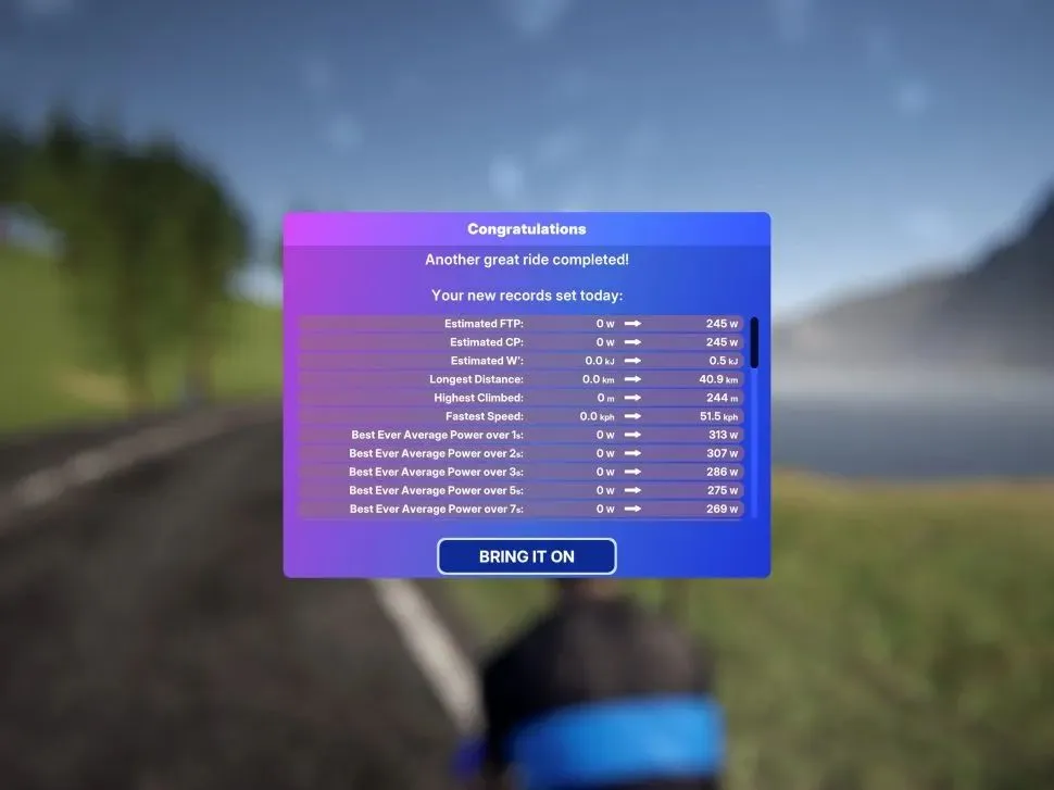 There is also another feature I quite like, which is Zen mode. Rather than being in the virtual world with other riders present, you ride in-world solo with no other riders. You can take this a step further to reduce distractions by using Focus mode. This removes the map and virtual world entirely giving you just a data screen to focus on your efforts. I like having the virtual world in the background, and also having riders to chase, but these modes make the training more suitable for a wider range of riders who may want more solitary suffering.Â