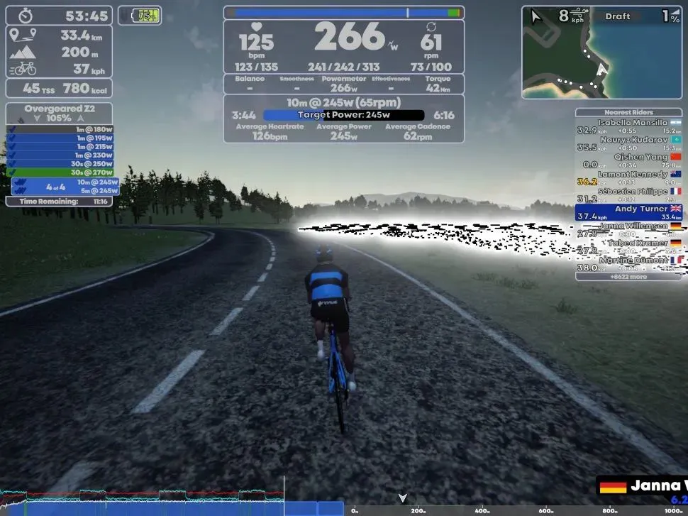 An element of Virtual that I really like is that when you select the workout to view it gives you a very detailed breakdown of the timings, intensity distribution, and efforts along with description. The workout screen when riding is also very effective, with gates showing the start and end of blocks, a breakdown of the blocks to the left, total workout time remaining, and intensity graphics at the base for the entire workout, not just a rolling 10 minutes like Zwift.Â