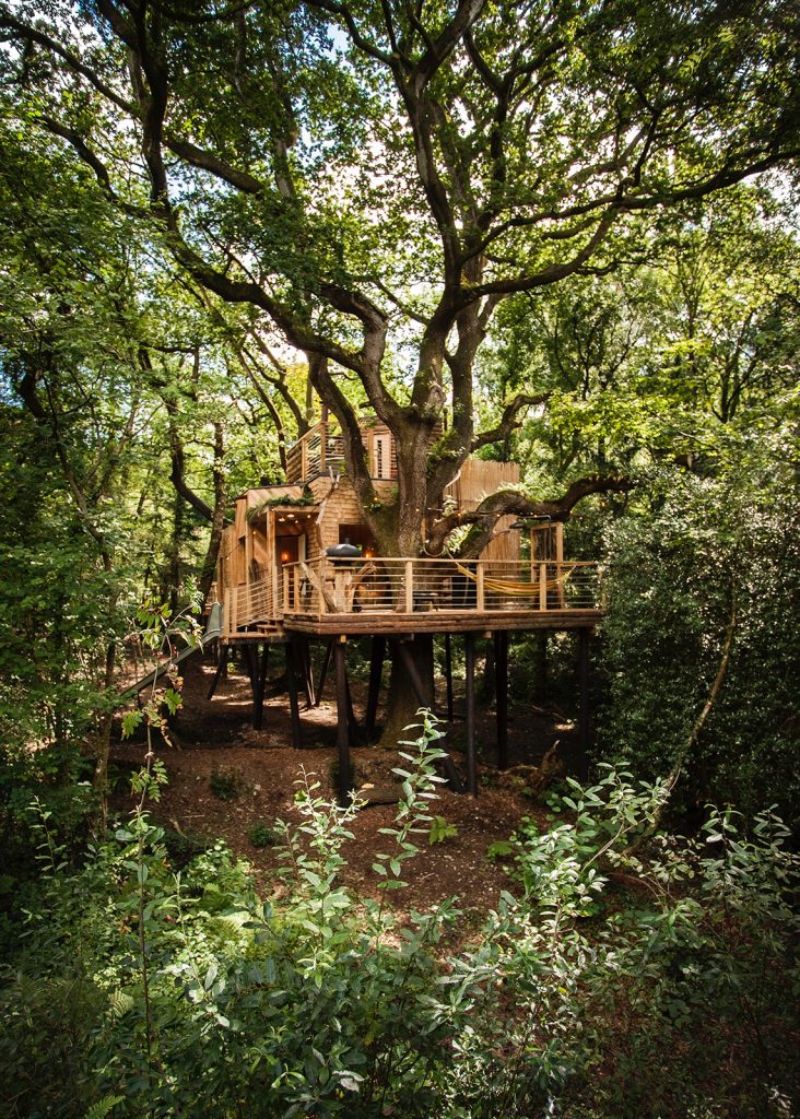 Each treehouse has been carefully constructed — reclaimed telegraph poles, coppiced sweet chestnut and timber boardwalks shape a network of spaces that feel both deliberate and restrained. Interiors are compact but considered, opening outward to filtered light, views across the Axe Valley and a landscape managed for biodiversity. Alongside the RIBA awards, the approach has earned a Visit England Gold accolade and ROSE award.