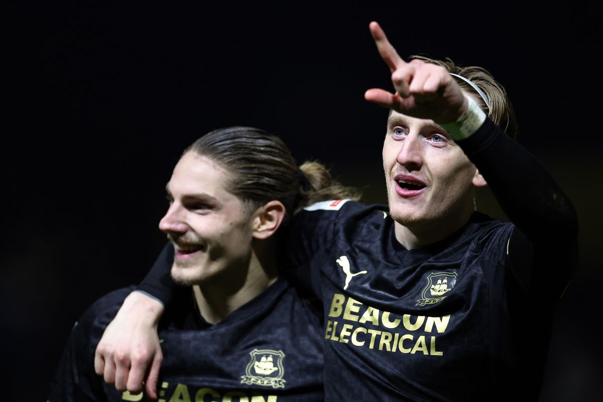 BRISTOL, ENGLAND – JANUARY 13: Lorent Tolaj of Plymouth Argyle celebrates with team-mate Ronan Curtis who provided the assist after scoring his team’s third goal during the Vertu Trophy match between Bristol Rovers and Plymouth Argyle at Memorial Stadium on January 13, 2026 in Bristol, England. (Photo by Dan Istitene/Getty Images)(Image: Getty Images)