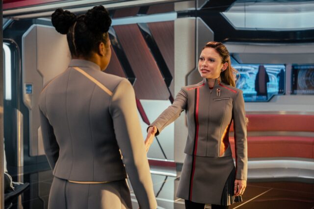 Starfleet Academy is ostensibly a follow-up series to Star Trek: Discovery; however, it doesn’t feel like a spin-off, nor does it feel like season 6 of Disco. This is especially surprising given how many (if not most) of those working behind the scenes also worked on Discovery, plus the show is shot on the same stages at Pinewood Studios, in Toronto. The 32nd century setting is the same, complete with its accompanying aesthetic and technology like detached nacelles, robotic DoTs, and programable matter, but Academy still feels like something new, or at least puts a spin on the familiar, like having Braka use programable matter as a weapon. And for being a follow-up show, there were surprisingly few nods to Discovery. Admirable Vance was the only crossover character in the pilot, there was a brief mention of the USS Discovery itself, but that was it: No big-name cameo from the previous show to kick it off as was done in TNG, DS9, Voyager, and Enterprise. While Starfleet Academy‘s big story is tied into the aftermath of “The Burn” that dominated the latter seasons of Disco, it is presented here with a simple introduction, eliminating the need need to have seen the previous show. The message seems clear: This is a new, different show with its own voice, style, structure, and tone. Let’s hope Academy can take the best bits of Discovery and leave the rest behind.