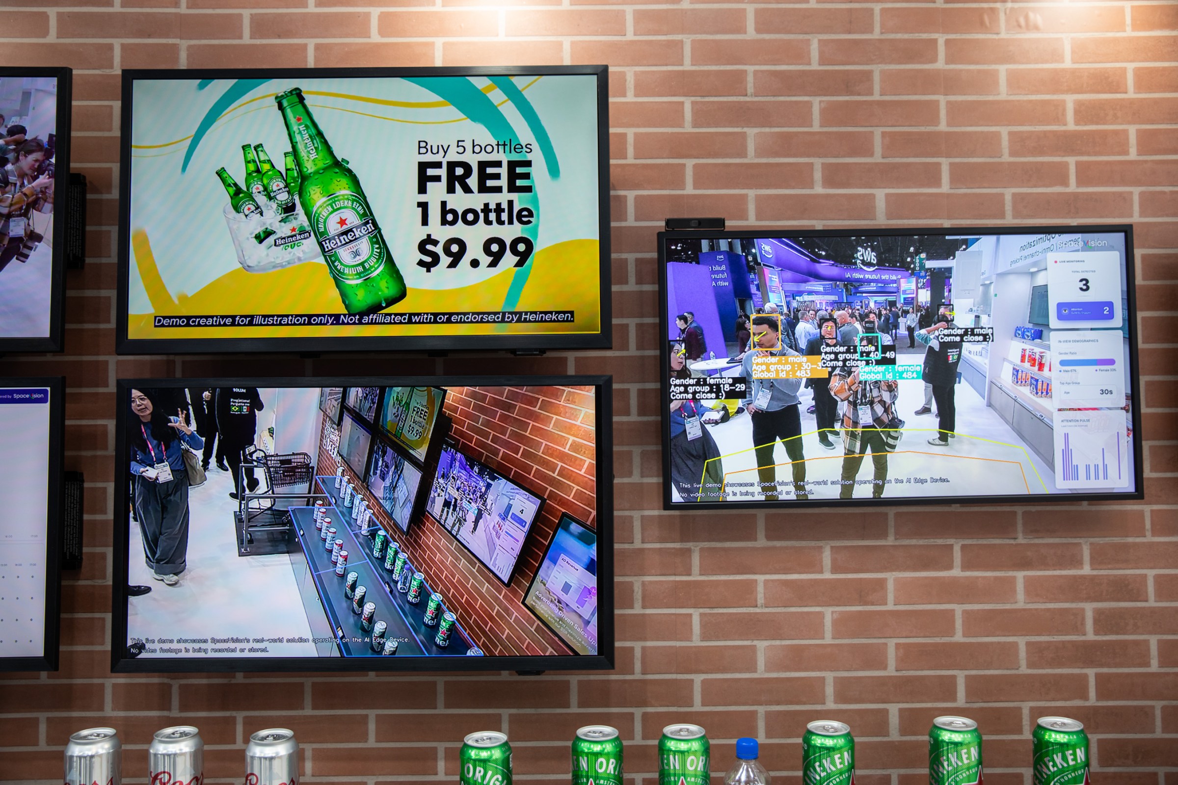 Solum is a South Korean company specializing in digital displays and shelves — those signs in the supermarket playing glossy ads for chips or beer, for example. But the next iteration is to hyper-personalize and target shoppers in stores, the way digital retailers are able to do to online shoppers. Using a technology built by a South Korean startup called SpaceVision, a retailer could assign a number to each shopper and track their movements through a store: how long they watched an ad, whether they simply walked by without engaging, if they picked up a product off the shelf. The store could then use that data to trigger certain behaviors: for example, if you watched a certain chip ad on a display, the store could push through a deal for you for beer to go with your chip purchase; it applies the tracking of online shopping into the real world. As I approached a wall of Coors and Heineken (not affiliated with SpaceVision) cans arranged on a shelf at the Solum booth, I noticed a screen above the display. It took me a moment to realize my own image was staring back at me, captured by the SpaceVision demo. With a bold box surrounding my face, I was Global ID number 485, gender: female, age group: 18–29. Retailers can use the data to track the demographic breakdown of people who pass displays, along with their “glance” and “attention” rates and conversions.