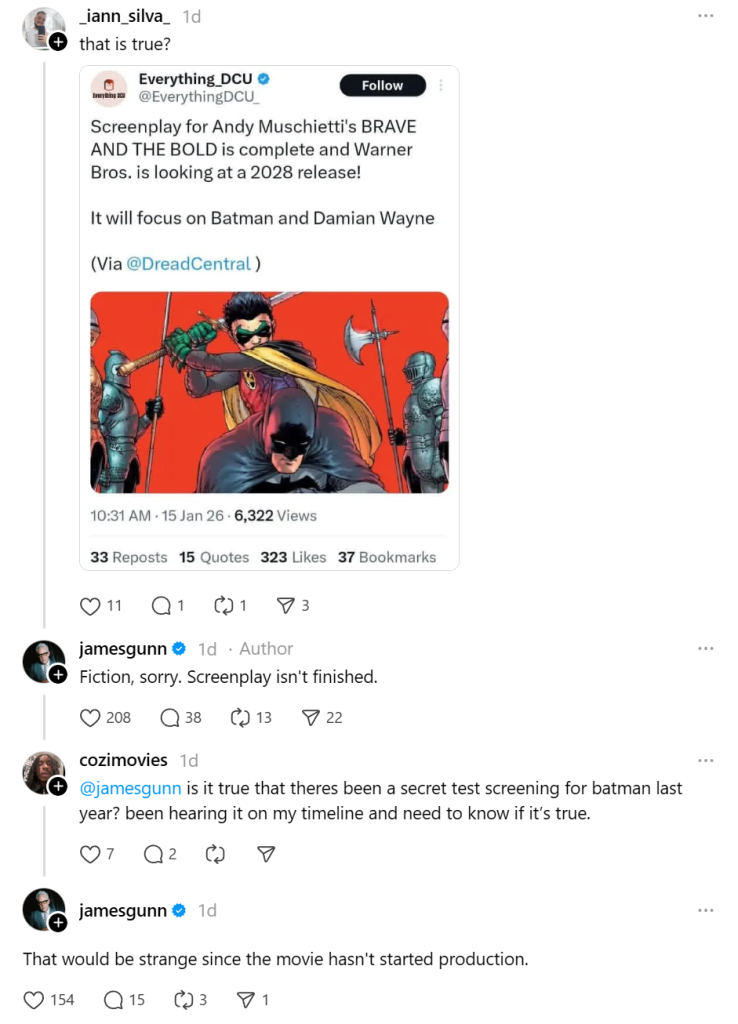 In a recent series of posts on Threads, Gunn answered some fan questions regarding upcoming projects in the DCU. For starters, Gunn was asked if recent reports that the DCU Batman movie, Brave and the Bold, had finished its screenplay and set a 2028 release date window, were true. According to Gunn, the story is completely false.