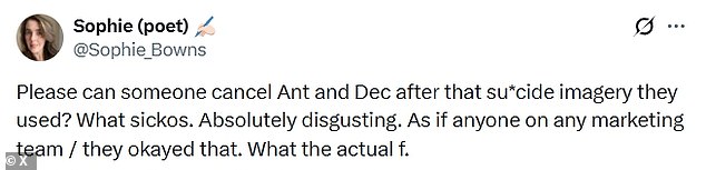 ‘It’s triggering, insensitive, and frankly reckless to push out as “entertainment” when so many families have been devastated by suicide and self-harm,’ she added. ‘You can promote a show without normalising imagery that could genuinely distress people.’