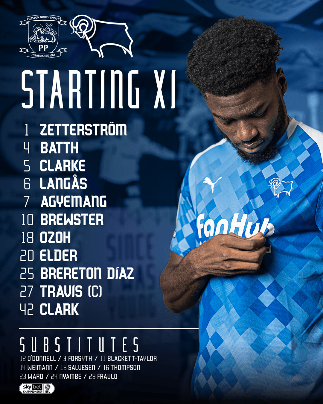 Derby County: Zetterström (GK), Batth, Clarke, Langås, Agyemang, Brewster, Ozoh, Elder, Brereton Díaz, Travis (C), Clark.