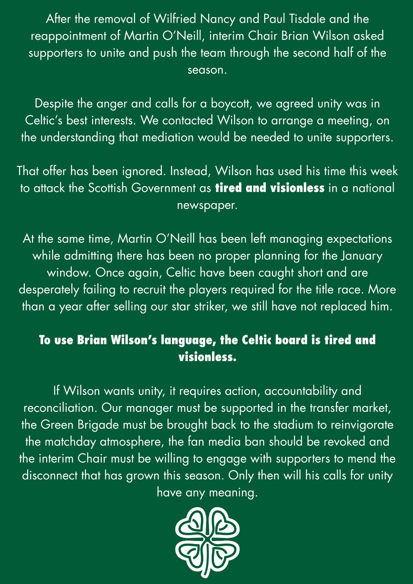 ‘If Wilson wants unity, it requires action, accountability and reconciliation. Our manager must be supported in the transfer market, the Green Brigade must be brought back to the stadium to reinvigorate the matchday atmosphere, the fan media ban should be revoked and the interim Chair must be willing to engage with supporters to mend the disconnect that has grown this season. Only then will his calls for unity have any meaning.’