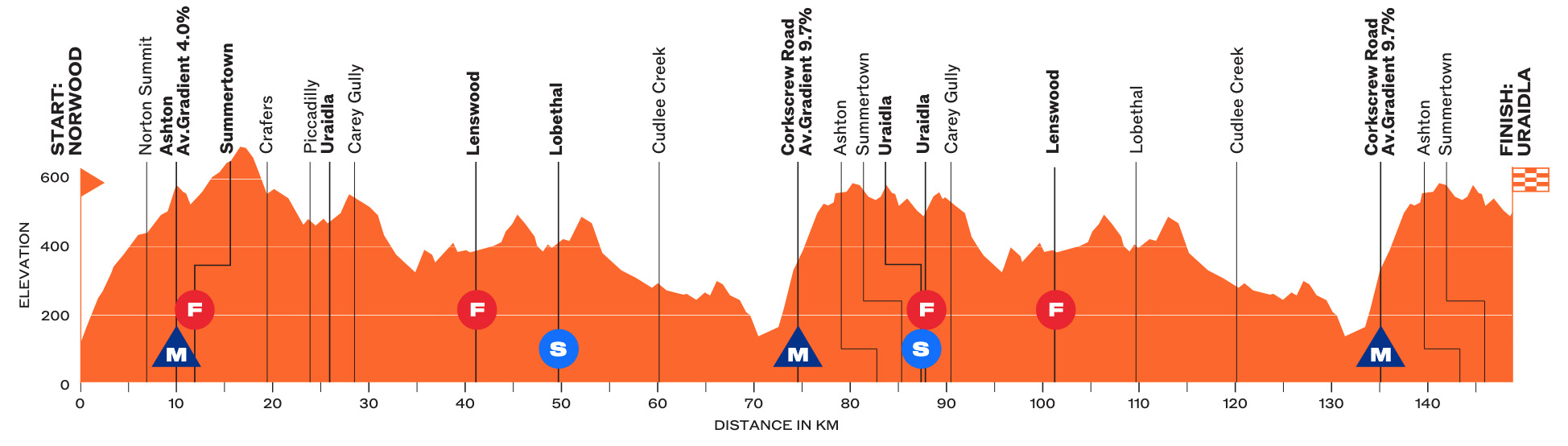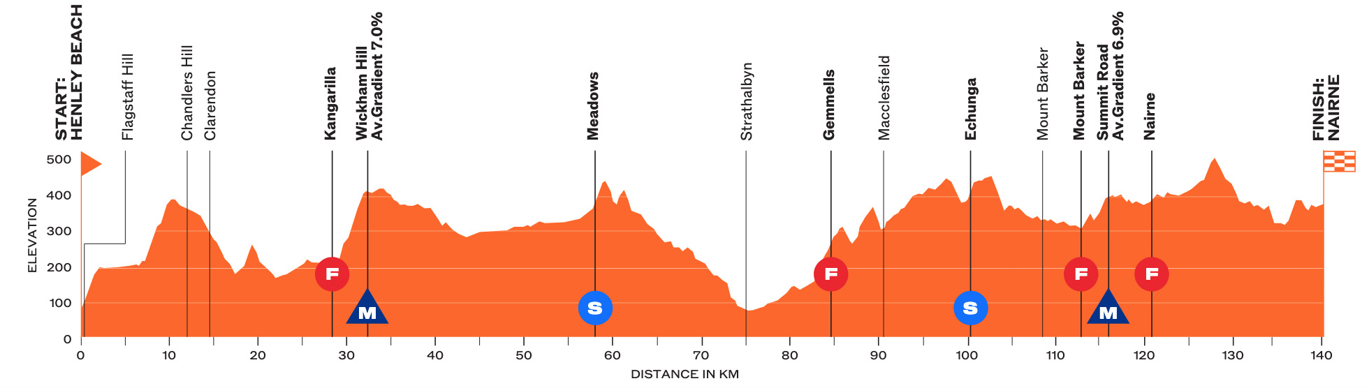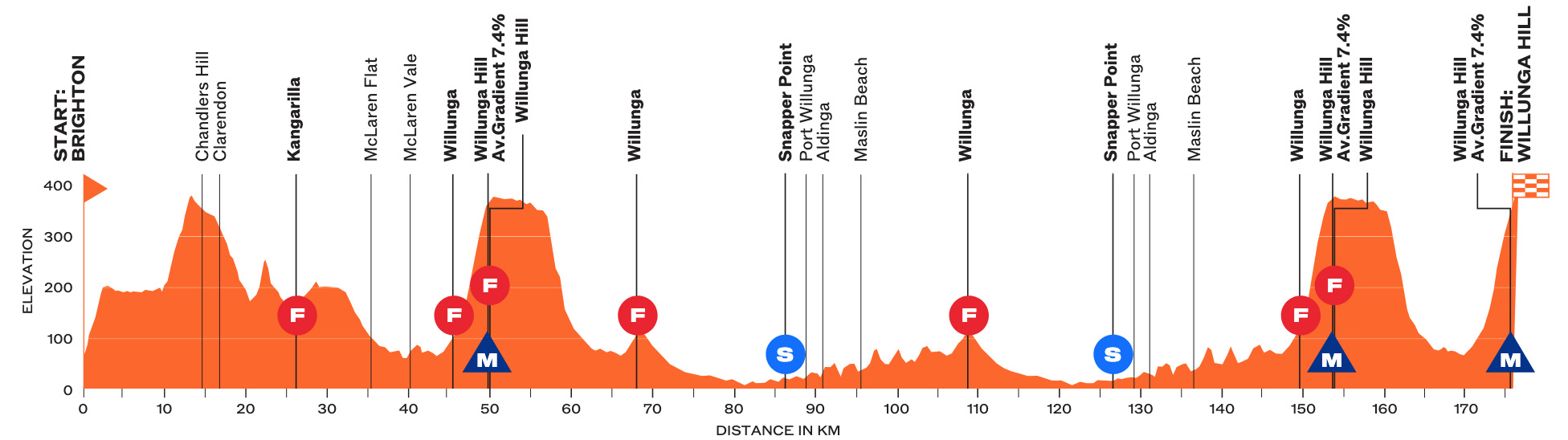 The classic Willunga stage with a trip to the coast and then racing through the McLaren vineyards. Watch out if the wind is up as riders can be caught out before the final climb. Old Willunga Hill is the key, it’s 3km at an average if 7.5%, a steady gradient and a wide road most of the way and exposed if there’s any wind. It’s a tactical climb, being on the right wheel matters as the speed is so high, the idea is to ride the slipstream of your rival and then strike out as late as possible but before everyone else.