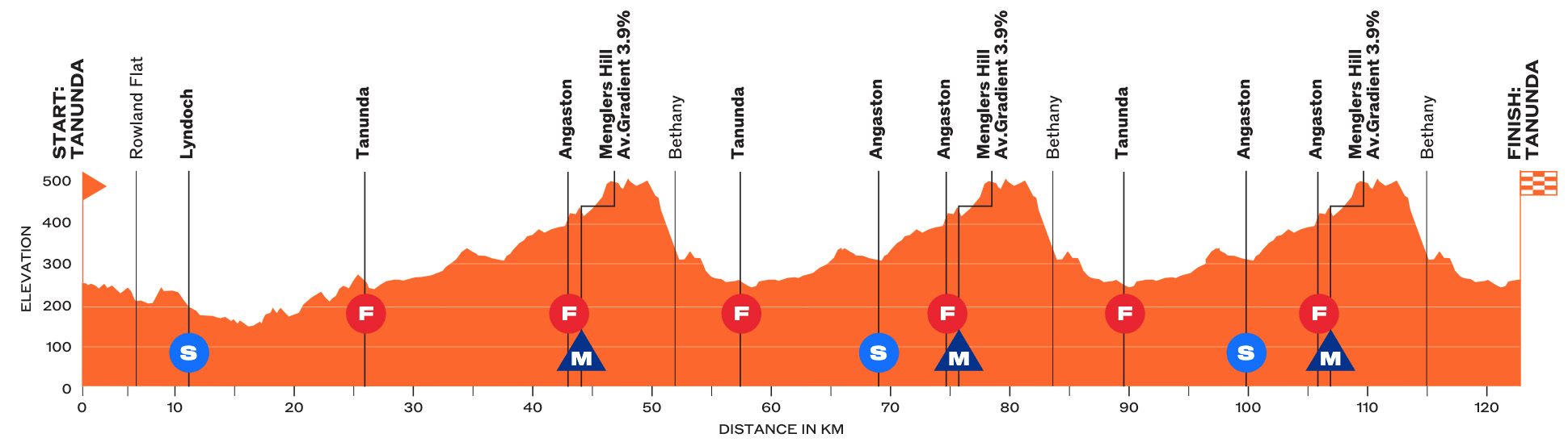 Stage 1 goes Tanunda. There is 1500m of climbing, decent for 120km in Janaury but it’s gradual. All the TDU race profiles here are generous with the y-axis, what looks spicy in the graphics is often a regular rise and Mengler’s Hill is a gentle 4% slope for most of the way. Recent visits to Tanunda have all seen a regular sprint finish and this feels even more likely given there’s only one stage left for the sprinters.