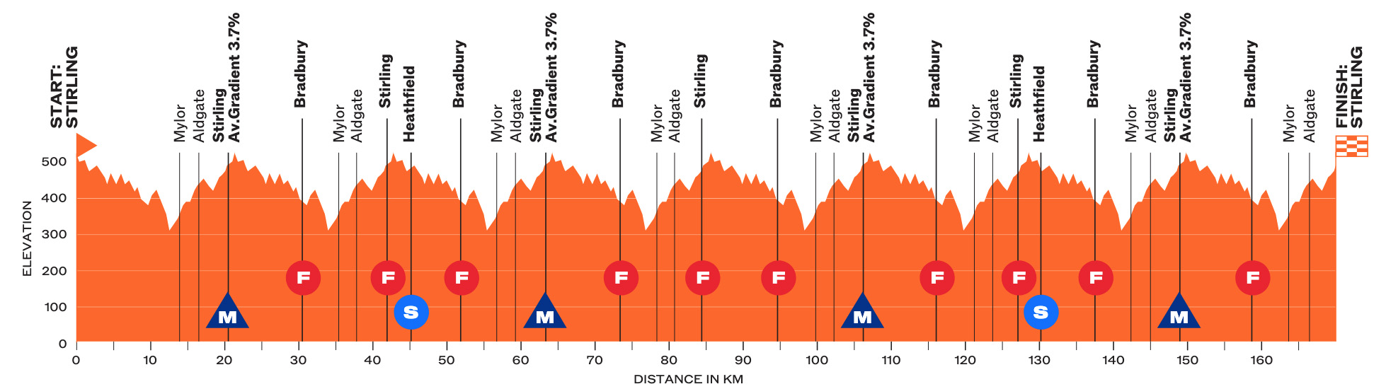 Another hilly day, this time 3,500m of vertical gain and relatively long at 170km. This features the regular road to Stirling seen in the past, a finish where Caleb Ewan has won before but also the likes of Diego Ulissi and Jay McCarthy, it rises to the line then drops before kicking up again and timing counts. This time even Ewan in his pomp would struggle given the repeat efforts and distance.