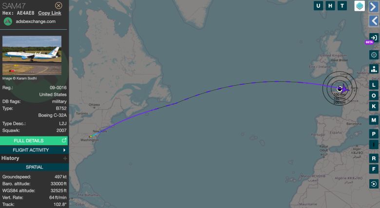 Open-source flight tracking data from ADS-B Exchange shows Air Force One making a turn over the Atlantic Ocean off the easternmost tip of Long Island, over an hour into the flight.