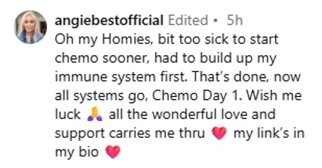 Angie later added in a caption alongside the video: ‘Oh my Homies, bit too sick to start chemo sooner, had to build up my immune system first.