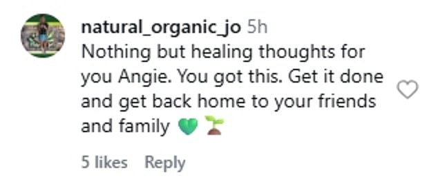 ‘Nothing but healing thoughts for you Angie. You got this. Get it done and get back home to your friends and family’;