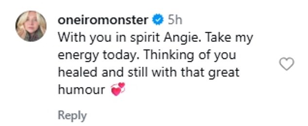 ‘With you in spirit Angie. Take my energy today. Thinking of you healed and still with that great humour’;