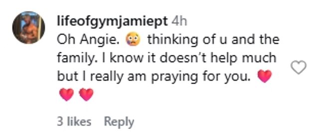 Fans flooded Angie with well-wishes, with one writing: ‘Oh Angie. thinking of u and the family. I know it doesn’t help much but I really am praying for you’;