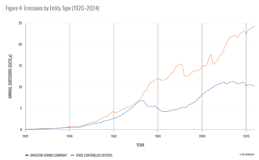 Influence Map’s chart shows that the emissions of state-controlled entities (orange) are rising while investor-owned companies (blue) have stayed largely flat.