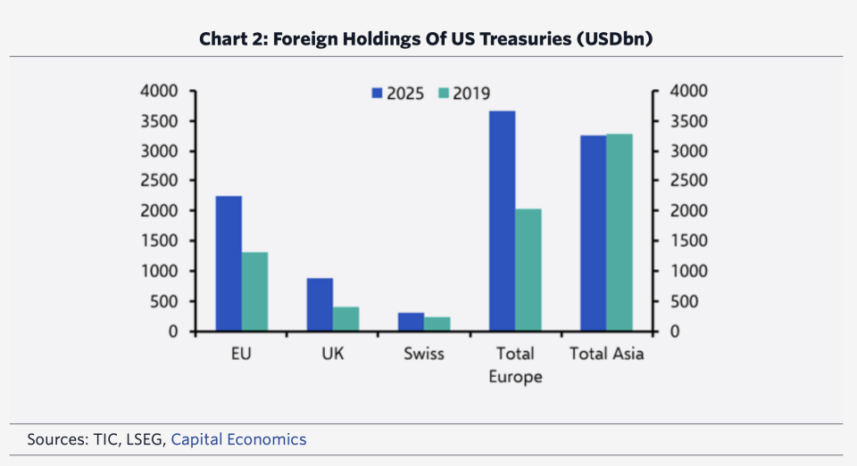 “Not only would it come at a financial cost, it would invite a response in kind: US investors hold large amounts of European government bonds too!” Capital Economics deputy chief markets economist Jonas Goltermann added. “Beyond that, European banks remain reliant on dollar funding that is ultimately backstopped by the Federal Reserve. ‘Escalation dominance,’ to use the military phrase, is firmly in favour of the US.”