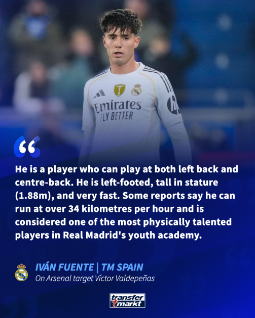Premier League and Champions League leaders Arsenal look set to have a quiet January transfer window in terms of incomings. Perhaps expected after Mikel Arteta’s team laid out €295 million to sign eight first-team players in the summer. The biggest winter transfer stories around Arsenal seem to be emerging on outgoings, with teenage attacking midfielder Ethan Nwaneri set to go to Marseille on loan and Oleksandr Zinchenko closing on a permanent move to Ajax, after a failed loan spell at Nottingham Forest. However, one future star the Gunners are heavily tracking is Real Madrid’s 18-year-old defender Víctor Valdepeñas. He has a current market value of €3 million.
