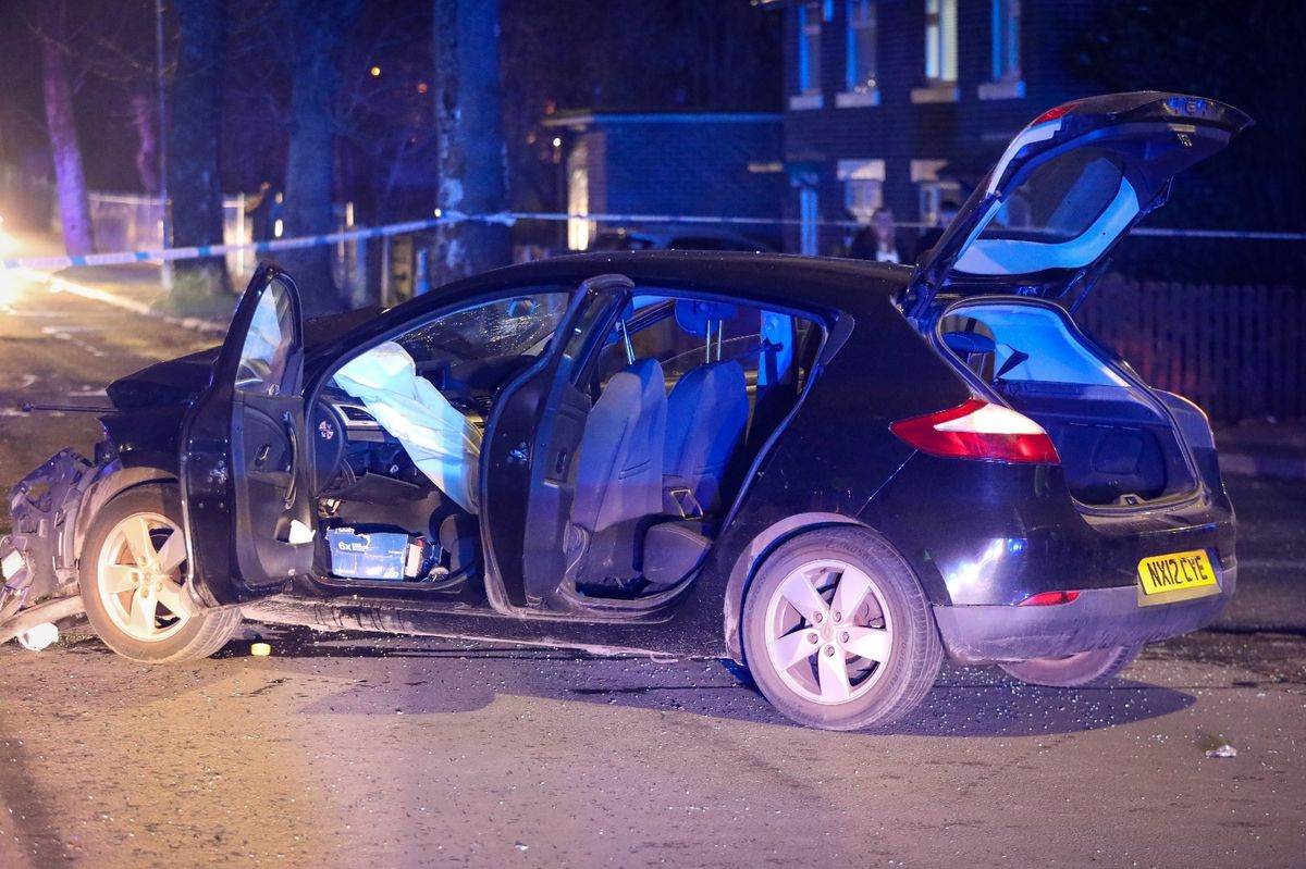 The front end of two saloon cars appeared to have suffered significant damage, with one damaged car ending up in the middle of the road near a roundabout while the other ended in a garden after ploughing through a hedge.