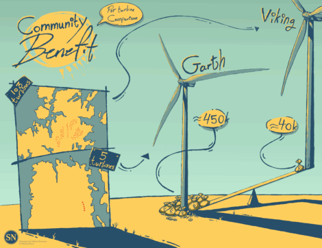In other words, one Viking turbine (4.2 MW) will return around £40,000 per year to Shetland’s two community funds, along with local jobs, business opportunities and income to landowners and crofting tenants.