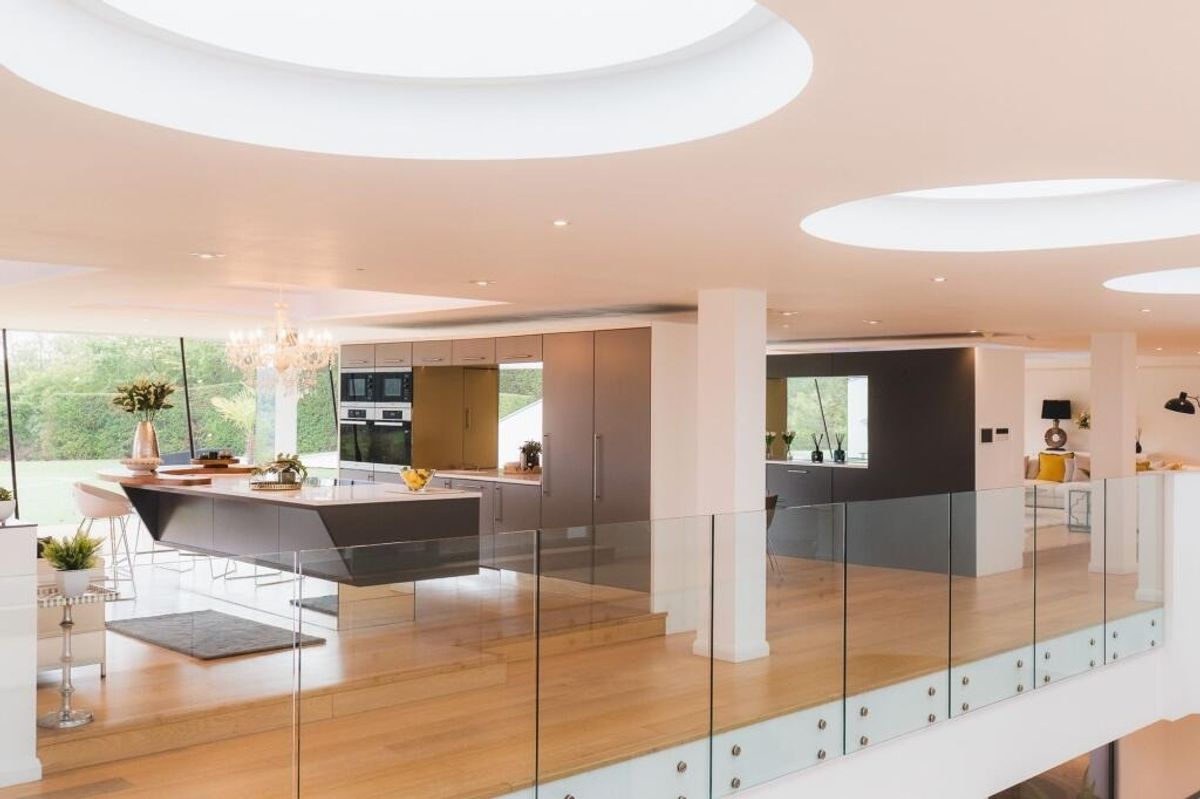 There are five double bedroom suites and five bathrooms across the property, including the impressive glass-enveloped master suite which has a Juliet balcony framing views over the top garden. In the corner of the en-suite is a bathtub, positioned to take in the panoramic view stretching for miles across the Cheshire countryside and local skyline.