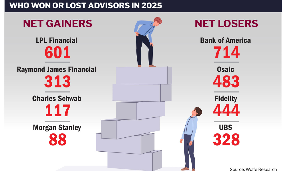The biggest losers of financial advisors in 2025, according to Wolfe Research, were: Bank of America, a net decline of 714; Osaic, down 483; Fidelity, negative 444; and UBS, a drop of 328.