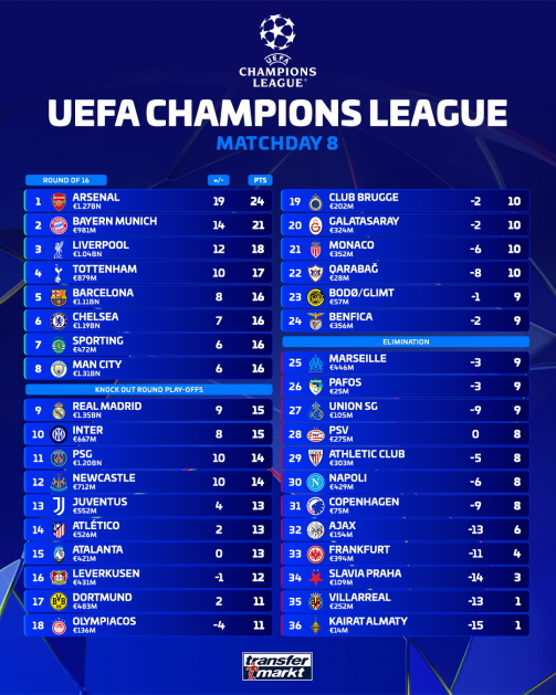 The final matchday of the Champions League league phase certainly lived up to expectations during a thrilling night of football on Wednesday evening. There were as many as 18 matches being played simultaneously, with the table taking many different shapes across the 90 minutes of action. Arsenal, Bayern Munich, Liverpool, Tottenham, Barcelona, Chelsea, Sporting and Man City all finished in the top eight and confirmed their places in the round of 16. While some big teams are into the play-offs, with the draw being made from 11am GMT this Friday. You can see it below!