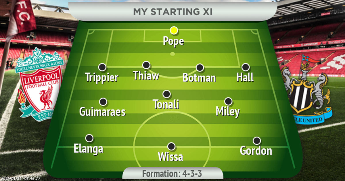 My NUFC XI: Pope, Trippier, Thiaw, Botman, Hall, Tonali, Guimaraes, Miley, Gordon, Elanga, Wissa.
