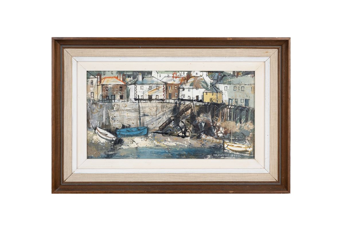 Signed by Hammond Steel in the lower right-hand corner, the work captures the brooding atmosphere and texture for which the artist is well known. Many of the buildings shown remain instantly recognisable to visitors to the Cornish fishing village today.