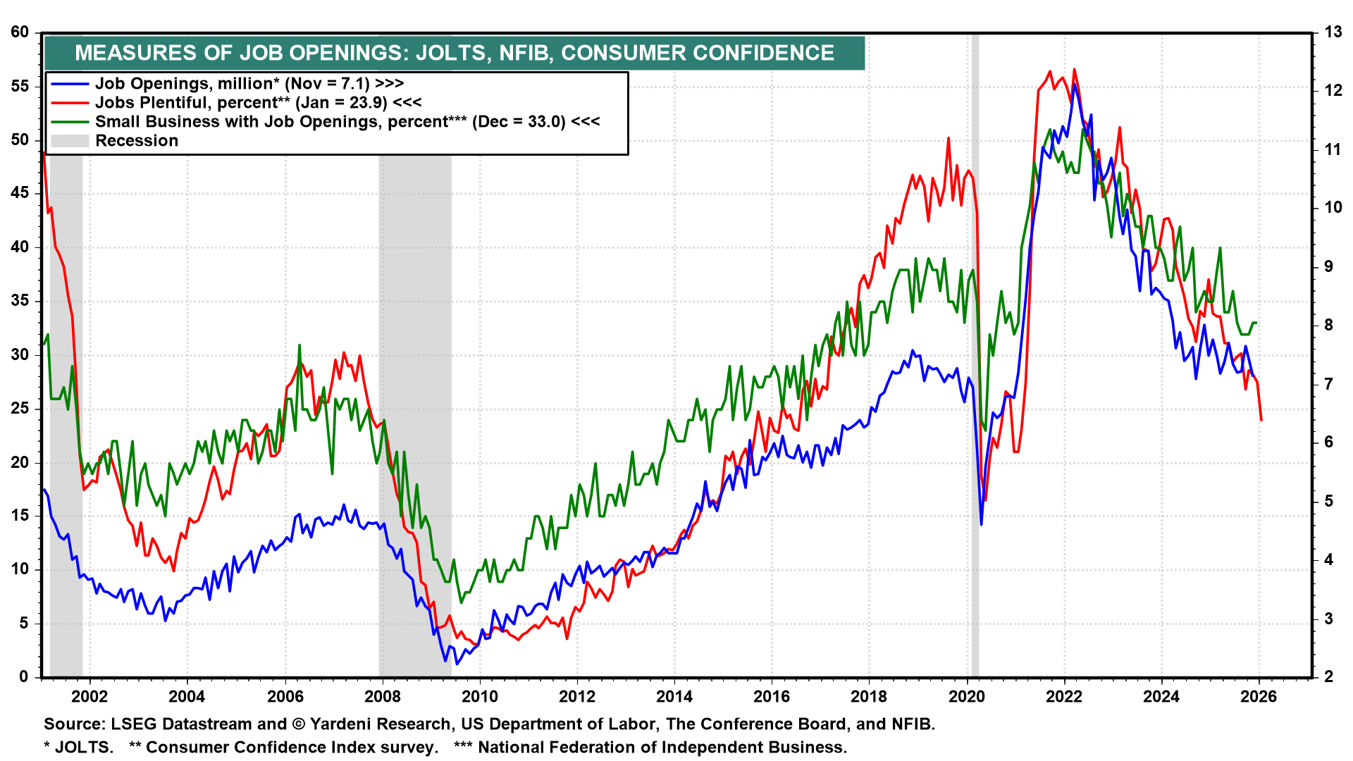 (3) JOLTS. The November Job Openings and Labor Turnover Survey showed that job openings edged down (chart). The Conference Board’s jobs-plentiful series suggests that job openings remain on a downward trend.