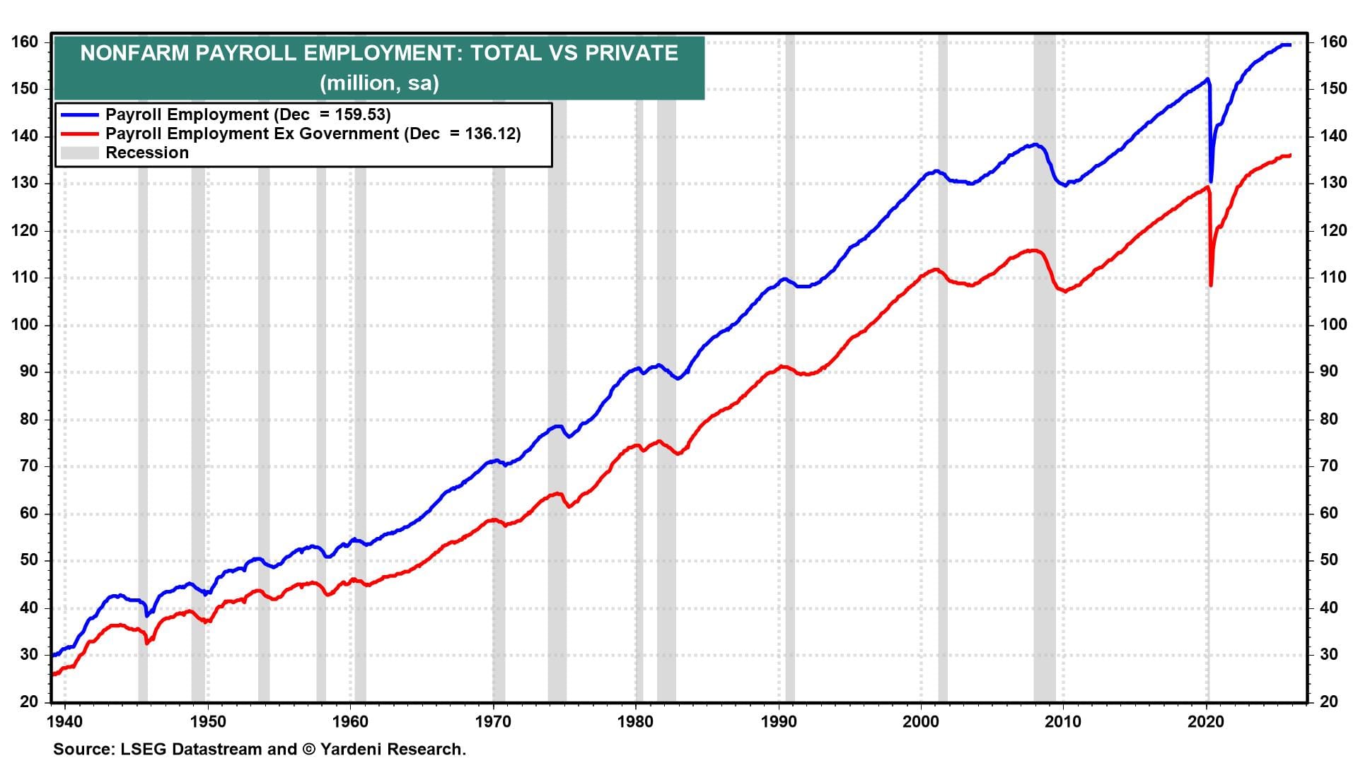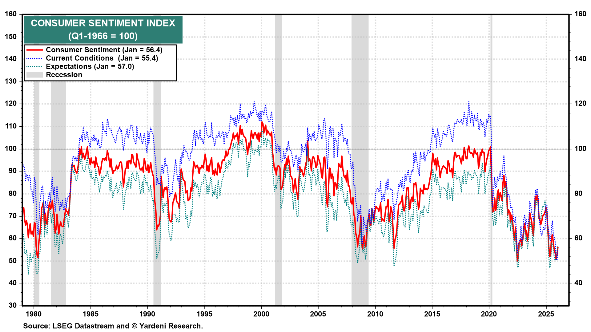 (4) Consumer expectations. The preliminary University of Michigan consumer sentiment reading for February (Fri) is likely to be steady to weaker following January’s final 56.4 reading amid labor market concerns and elevated prices (chart). This survey data has been too pessimistic about the outlook for consumer spending for quite some time. Ignore it.
