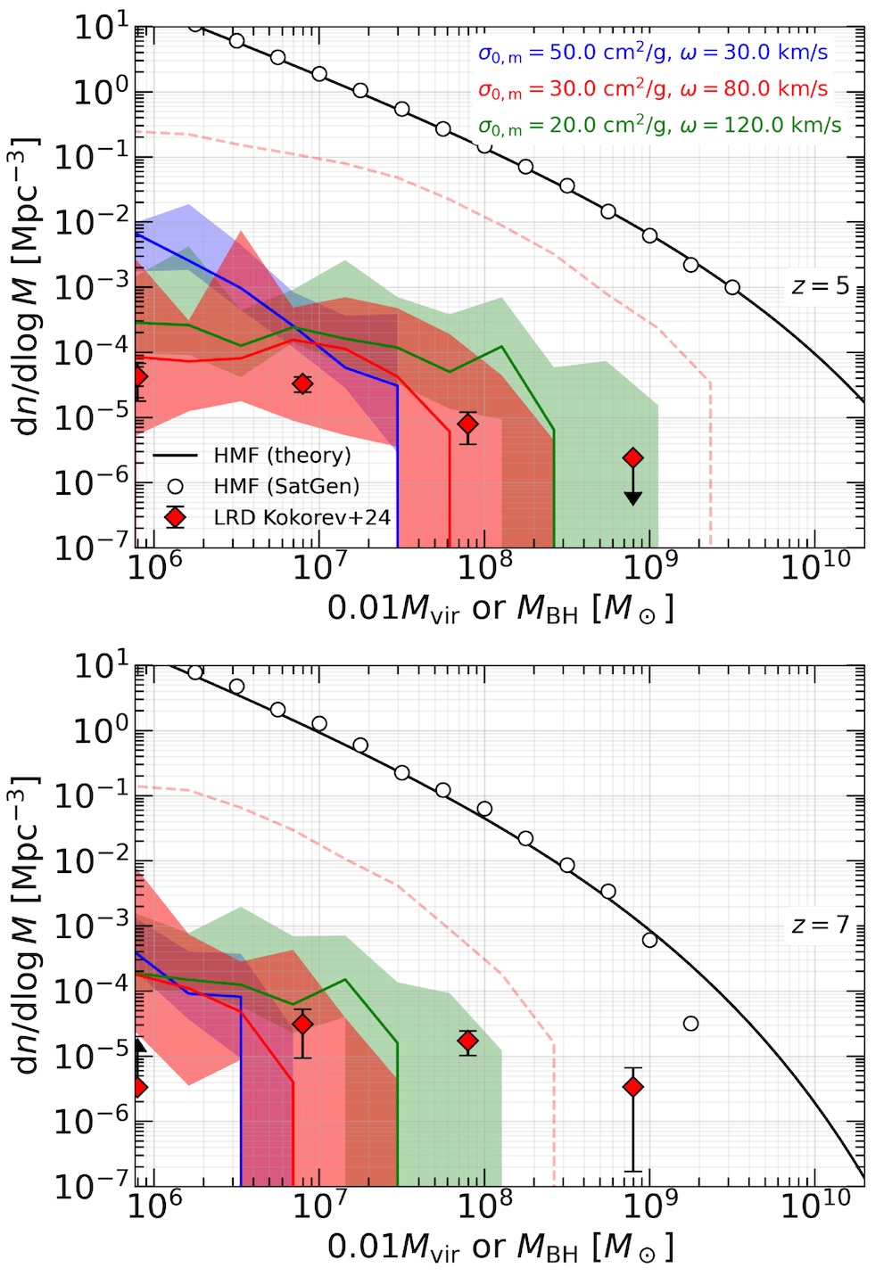 Comparison of the inferred black hole population in little red dots (red diamonds) to models of black holes formed in dark matter halo collapse (shaded areas) at two redshifts. The red area shows the fiducial model, while the blue and green areas show the effects of changing the dark matter self-interaction cross-section. The dashed red lines show an extreme case in which the presence of baryons accelerates halo collapse. Click to enlarge. [Jiang et al. 2026]
