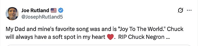 Said one fan: ‘My Dad and mine’s favorite song was and is Joy To The World. Chuck will always have a soft spot in my heart. RIP Chuck Negron …’